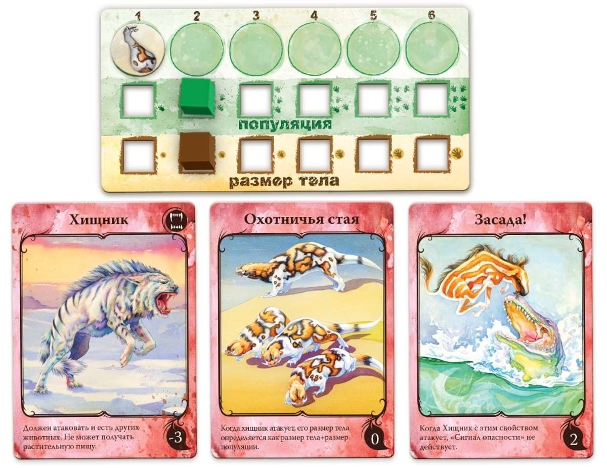 Время адаптироваться! Данная игра даст вам возможность поучаствовать в самом настоящем процессе эволюции видов. Выживание и адаптация - краеугольный камень игрового процесса. Выбирайте между хищными и травоядными животными, развивайте этот вид, создавая колонии, применяйте способности существ и распределяйте пропитание. Фаза кормежки крайне важна, ведь в конце хода, если животное не накормлено, оно умирает. За каждое выжившее существо и его способности игроки в конце игры получат победные очки. Кто соберет больше, тот и станет победителем!