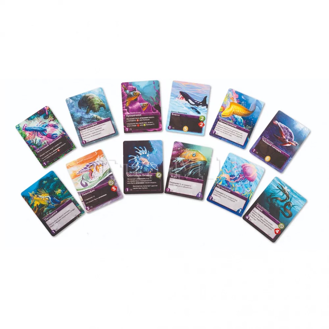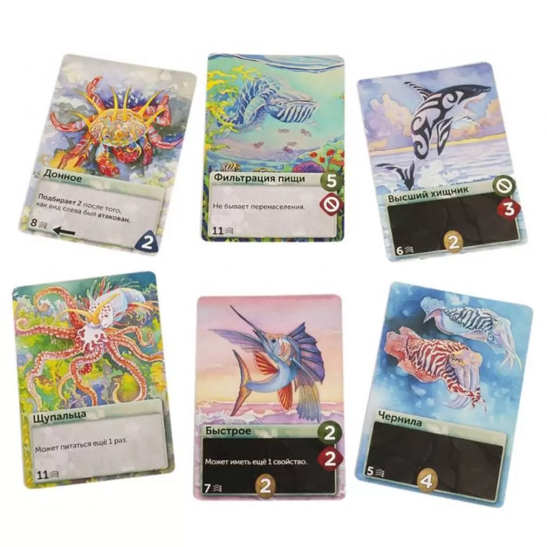 Эволюция под водной гладью! Новая игра в знаменитой серии предложит игрокам познакомиться с таинственными обитателями морских глубин и провести их через этапы эволюции, развивая и выращивая. Разыгрывая карты существ, игроки получают в пользование новые виды, либо улучшают уже имеющиеся. Хищные рыбы других игроков могут напасть на вас, и здесь самое время подумать о защитных чертах вида. Умение продумать свои ходы наперед и быстро адаптироваться станут очень важны в любой партии. Помимо этого, в данном выпуске вас ждет более ста уникальных карт, нарушающих привычное спокойствие океана и приносящее в морские просторы разных фантастических существ из фольклора и печатных романов. По ходу партии вы сможете активировать карты сценариев, которые могут изменить игру в одно мгновение! Адаптируйтесь, развивайтесь, выживайте и станьте победителем, сохранив как можно больше своих существ!