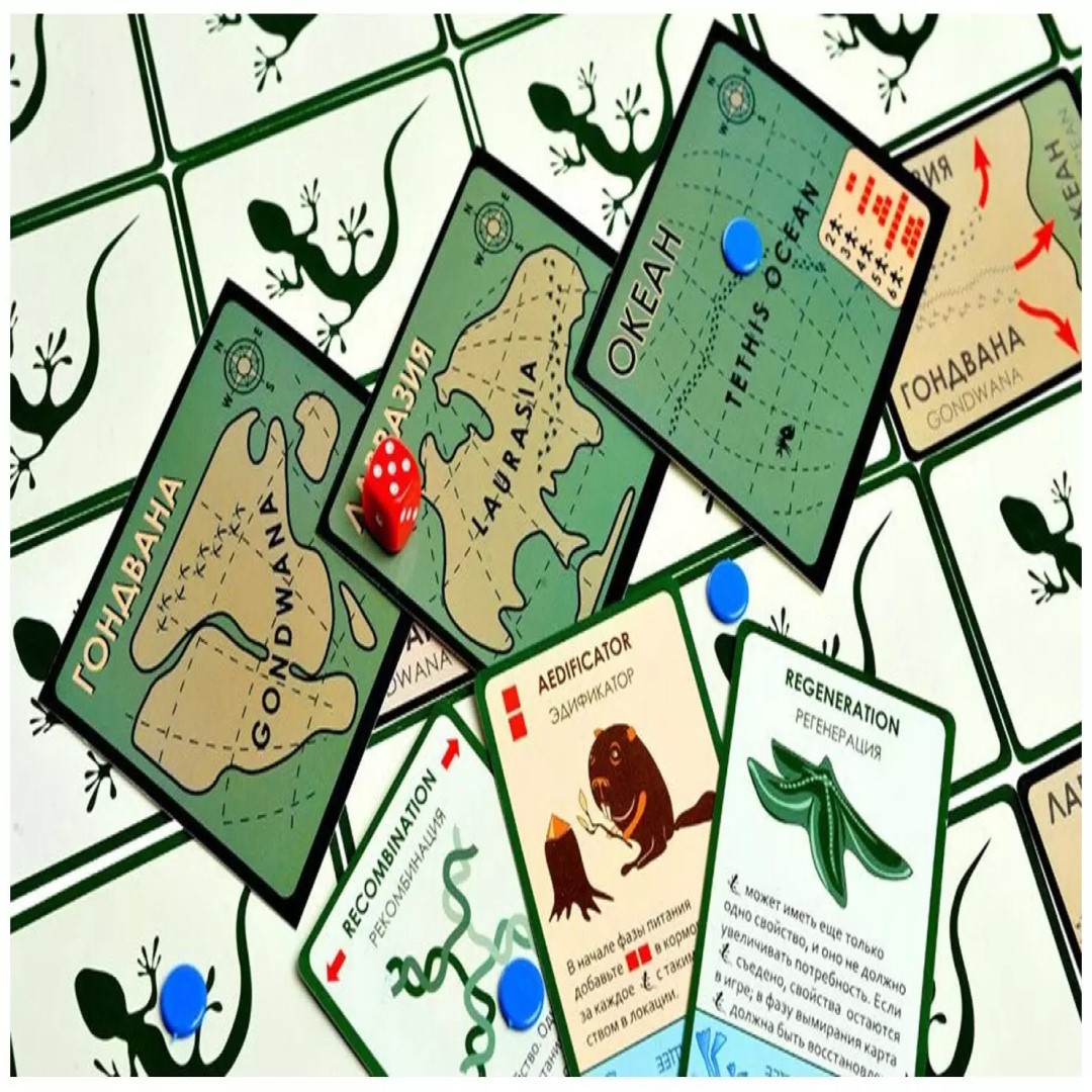 В данном состязании игрокам предстоит с помощью карт развивать хищных или плотоядных существ, улучшая их и подкармливая. Кормежка крайне важна, ведь животные, которым не достанется жетонов еды, покинут игру. За определенное количество ходов вам нужно постараться сохранить свой вид максимально насыщенным, создавая новых существ и улучшая старых. Данный набор включает в себя несколько дополнений, благодаря которым возможностей для победы станет великое множество. Теперь вы сможете создать летающих существ, а также совершенно уникальные виды, способные перемещаться между континентами.