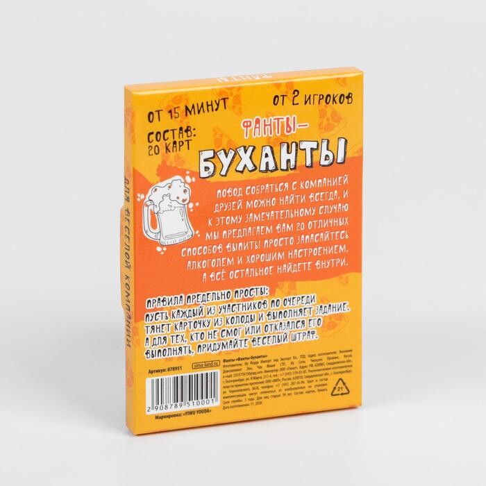 В небольшой коробке вас ждет набор веселых заданий для застолья. Каждый участник по очереди тянет карту и выполняет написанное. Если игрок не сможет справиться с заданием, его ждет штраф. Пейте, веселитесь и сделайте любой праздник незабываемым!