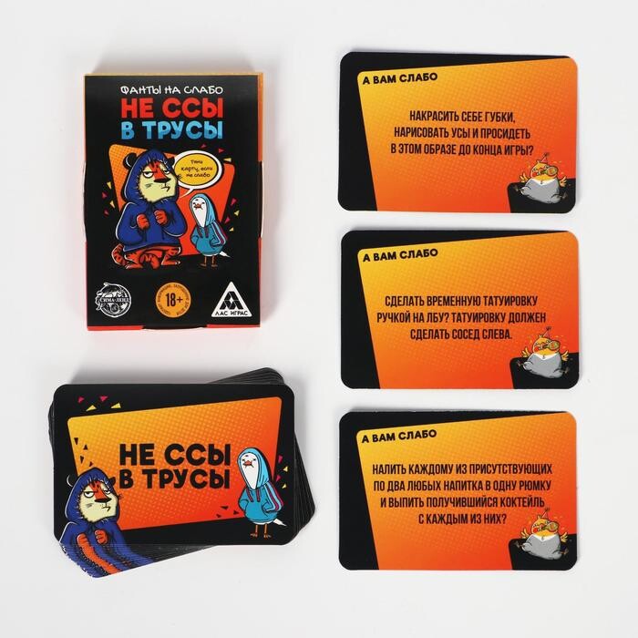 В небольшой коробке вас ждут безумные задания для взрослой компании. Выпить без помощи рук, нарисовать татуировку ручкой, а также попробовать коктейль из нескольких напитков, - и это только малая часть того, что ждет вас в этой игре. Веселитесь на полную и сделайте любой праздник незабываемым!