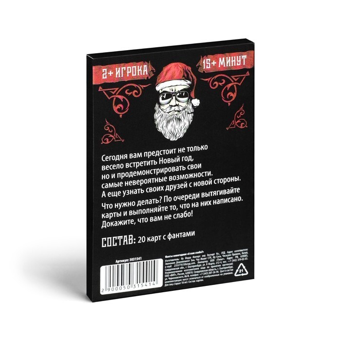 Яркая игра для новогоднего праздника! В коробке вы найдете карточки с разнообразными заданиями, которые легко скрасят ваши посиделки и предложат посоревноваться в скорости мышления, артистизме и сообразительности. Победитель здесь не так важен, как сам игровой процесс. Собирайтесь за одним столом и повеселитесь на славу!