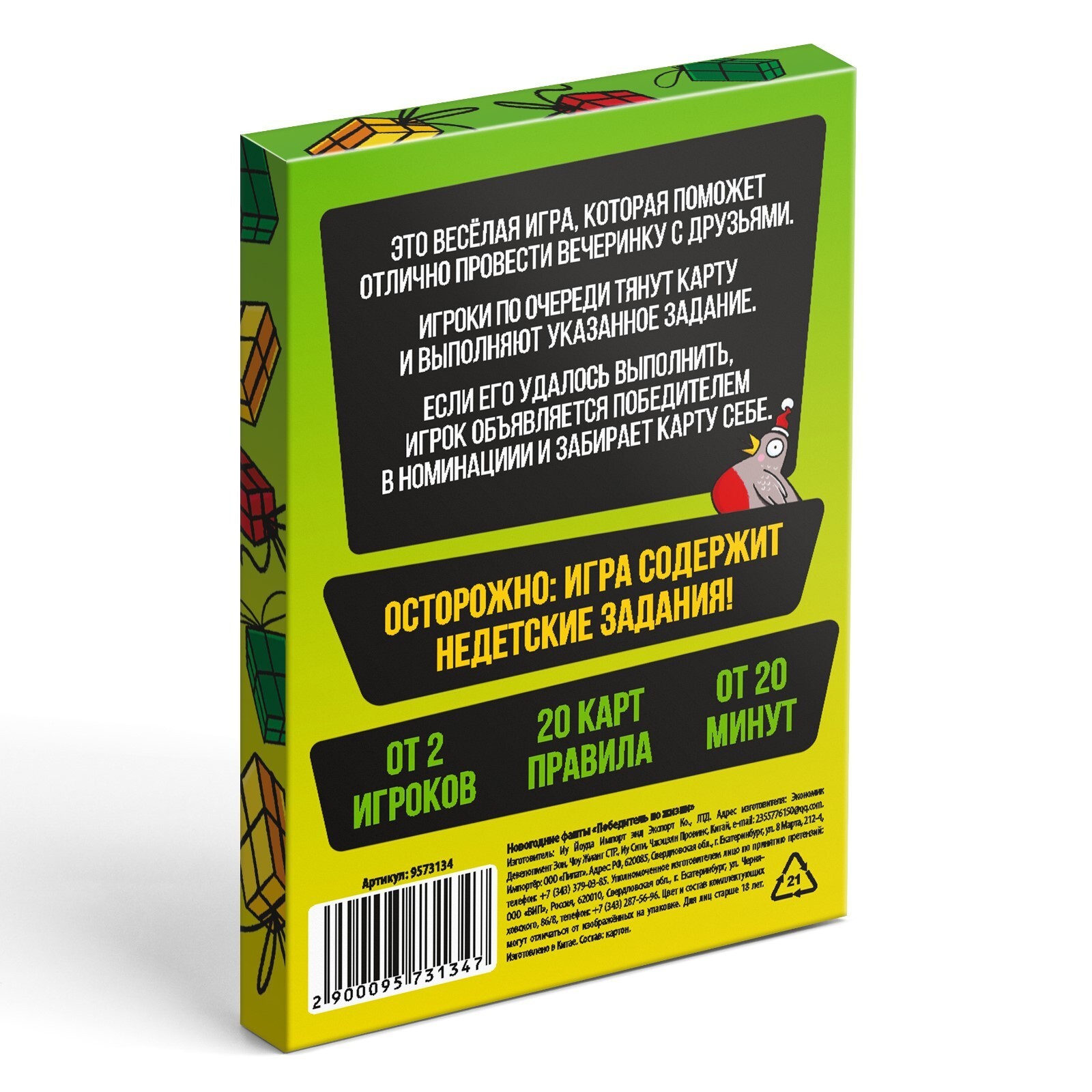 Новогодний набор заданий подойдет для застолья и поможет сделать ваш праздник еще более незабываемым! В коробке вы найдете двадцать карт, с помощью которых игрокам предстоит сразиться в знании песен, наряжать участника в роли елки, изображать пантомимы и участвовать в недетских заданиях!