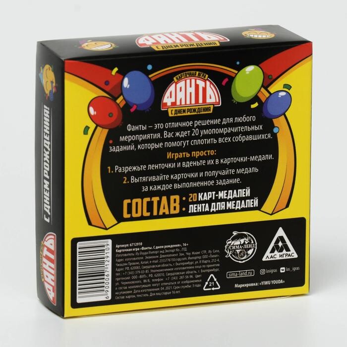 В небольшой коробке вас ждет море веселья и хорошего настроения! Данные фанты идеально подойдут для дня рождения. Вам предстоит танцевать, показывать пантомимы, быстро объяснять определенные слова, и все это для поздравления виновника торжества! Возьмите фанты с собой на праздник, и он точно запомнится вам надолго!