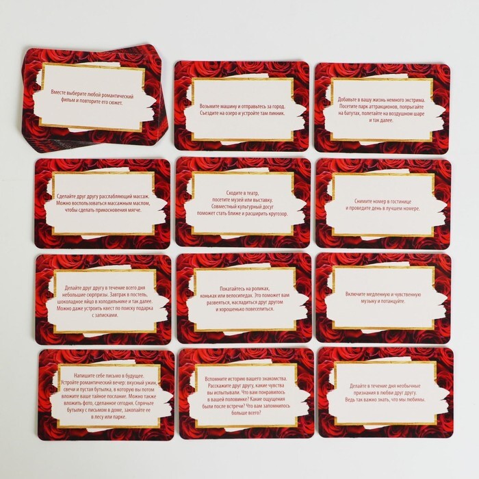 Проведите вечер со своей второй половинкой незабываемо! В небольшой коробке вас ждут разнообразные романтические задания, некоторые из которых будут горячими и откровенными. Создайте себе идеальное свидание и вспомните, за что вы любите человека рядом - признайтесь в любви нестандартно, посмотрите романтический фильм, устройте пикник. Спешите любить!