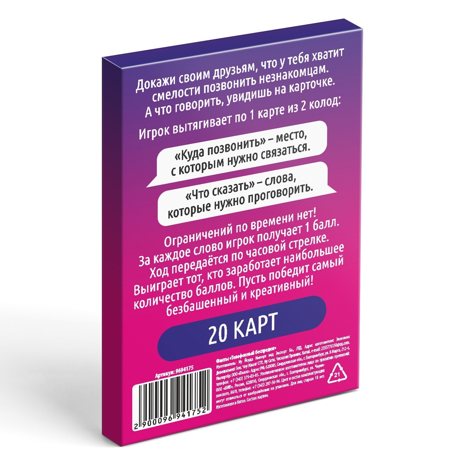 Доставайте телефон, в этой игре вас ждут необычные звонки! На картах вы найдете указания, куда позвонить и что сказать. За каждое сказанное слово игрок получит по одному баллу, а победит самый смелый участник! Звоните своим друзьям и родственникам, и говорите то что они бы вряд ли от вас могли услышать!