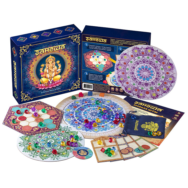 Кто преподнесет лучший дар богу мудрости Ганеше? Простая и азартная игра "Ганеша" постоянно будет ставить перед игроками вопрос - разместить драгоценные камни сейчас, или сохранить их для получения большего количества очков в будущем? В свой ход можно будет совершать и дополнительное действие - жертвовать драгоценными камнями для получения преимуществ. Простые правила и качественное оформление порадуют детей и взрослых, а настраиваемая сложность и ключевые моменты подойдут для разного количества игроков. Преподнесите лучший дар Ганеше!