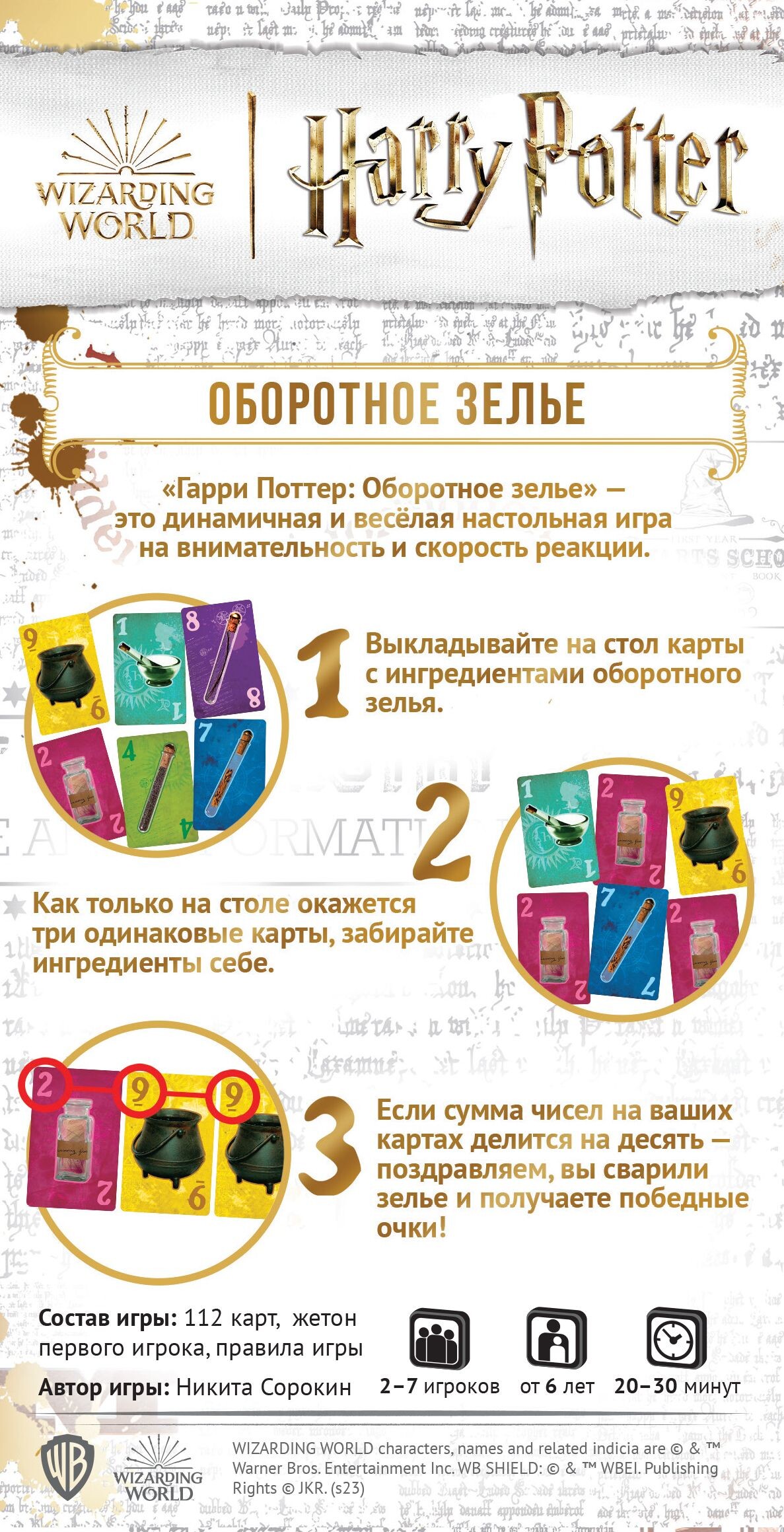 С помощью карт игрокам предстоит создать как можно больше зелий, причем их редкость выгодно повлияет на победу. На красиво и аутентично оформленных картах участников ждут различные необычные ингредиенты, колбы и цифры. Выкладывая по одной карте по очереди, игроки внимательно следят, выжидая момент, когда на столе появится три карты с одинаковым значением. Тогда вам нужно как можно быстрее схватить карты, а потом подсчитать общее количество цифр с них. Если сумма полученных цифр заканчивается на ноль, тогда карты станут вашими, а если нет - их придется вернуть. По итогу победит тот волшебник, что наберет наибольшее число карт!