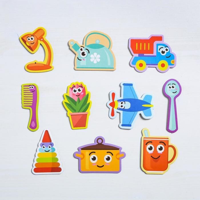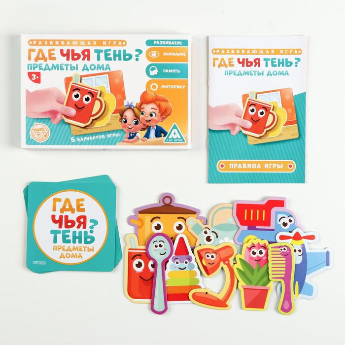Обладая яркими элементами и простыми правилами, игра поможет развить моторику и логику. Игрок будет брать предметы, называть их, а затем класть на карту так, чтобы форма предмета соответствовала форме тени, изображенной на карте. И это только один из вариантов игры. Помимо этого, нужно будет с закрытыми глазами определять предметы на ощупь, а также тренировать произношение и память. Собирайтесь за одним столом и весело проведите время!