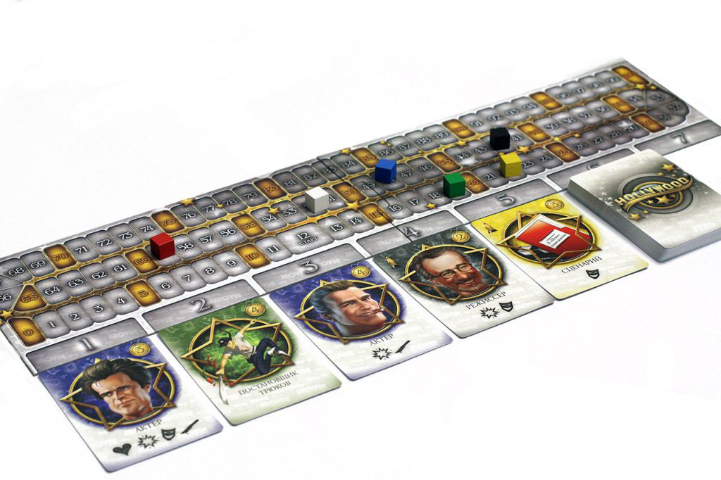 Под вспышки папарацци и звуки кинохлопушки, игра "Голливуд" предложит вам посоревноваться в съемках лучшего блокбастера. С помощью драфта, аукциона и розыгрыша карт, игроки создают фильм с минимум тремя картами - режиссера, сценария, и актера. Более звездные актеры приносят больше прибыли и наград, необходимых для победы. Через три игровых года производства происходит подсчет победных очков, и самый успешный босс студии получит всеобщее одобрение. Готовы посоревноваться?