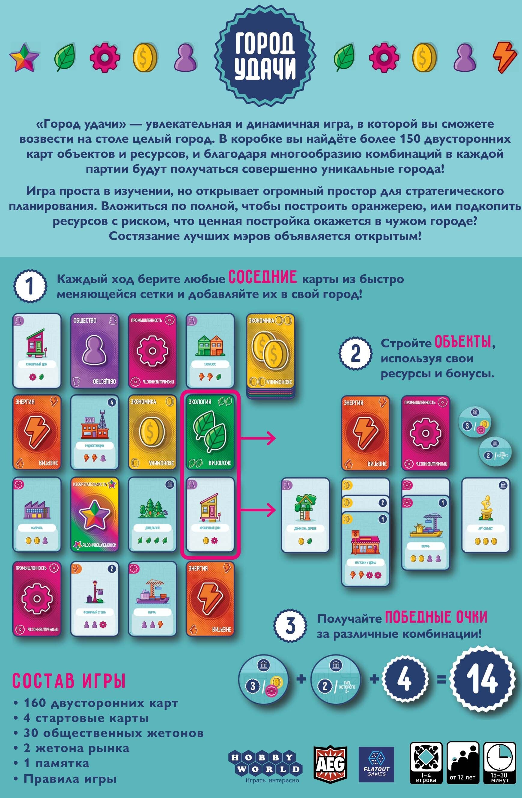 Доставайте карты и начинайте строить! Благодаря огромному количеству зданий и комбинаций каждая партия будет для вас интересна и в чем-то уникальна. Приобретайте новые карты за ресурсы и возводите свой город мечты. За определенные комбинации зданий вы получите больше призовых очков, а также можете применить специальные жетоны, которые также дадут преимущество. Помимо призовых очков, здания приносят и ресурсы, которые можно отложить до определенного момента. По истечении колоды с картами, посмотрите на свои успехи и подсчитайте свои очки. Тот игрок, который стал лучшим строителем, победит!