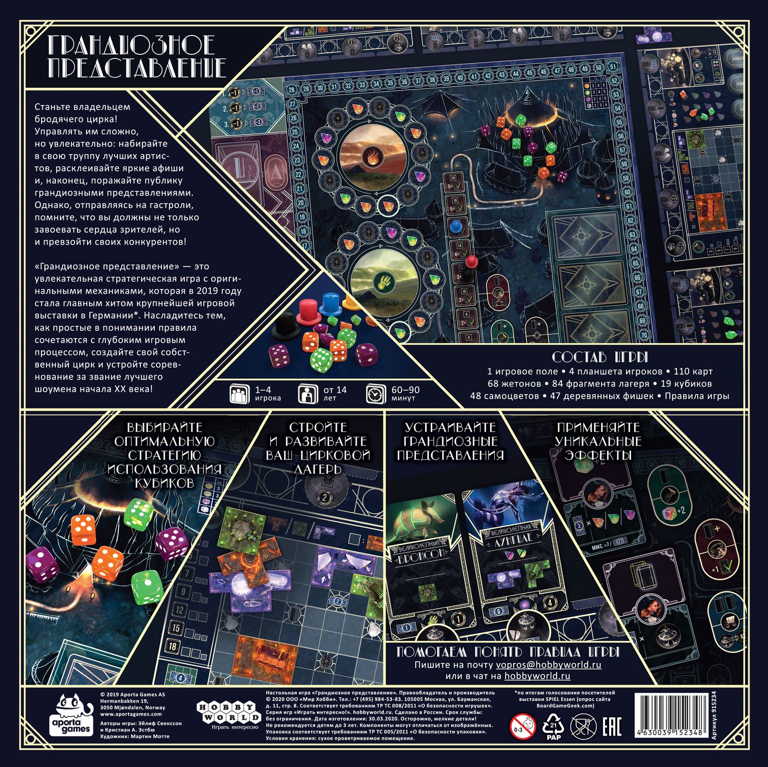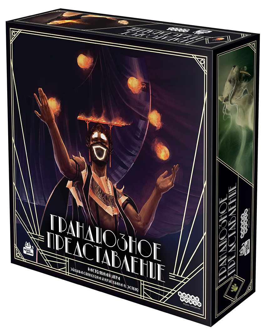 Готовы организовать лучшее цирковое выступление? "Грандиозное представление" поставит перед игроками задачу побороться за создание блистательных цирковых выступлений. Найм артистов, расширение территории с помощью специальных блоков и распространение рекламных афиш - лишь малая часть того, что ждет вас в коробке. Сюда же добавьте великолепную рисовку, волшебный мир и минимальное количество случайностей. Уже слышите звон аплодисментов? Пора организовать лучшее представление!