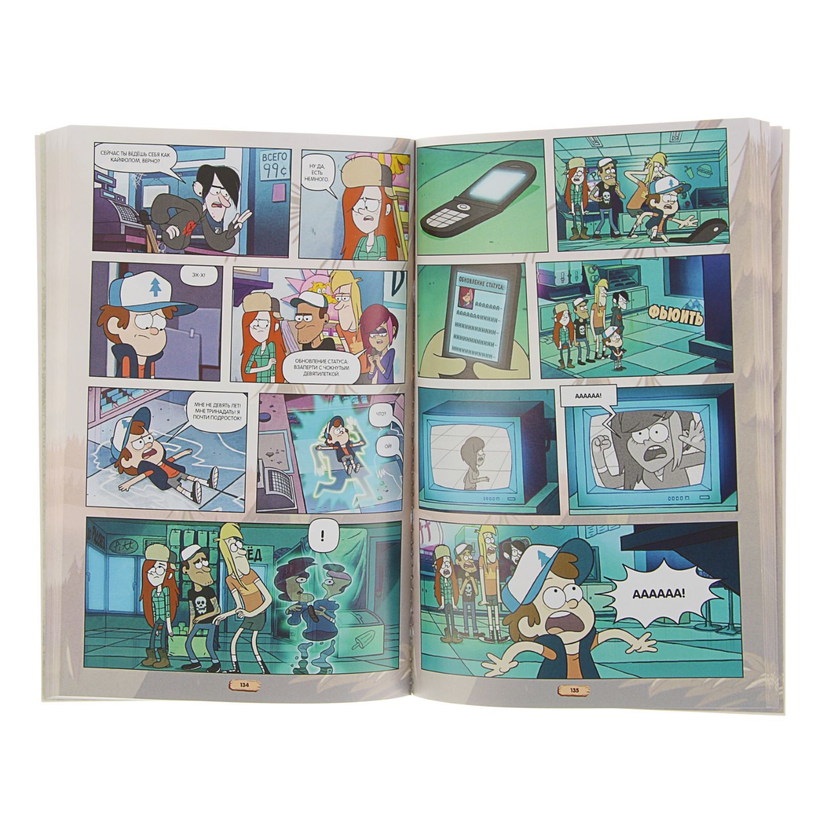 Отличный сборник комиксов по 4, 5, и 6-й сериям первого сезона «Гравити Фолз» отпечатан на мелованной бумаге, так что можно с удовольствием рассматривать картинки (и, кстати, заметить то, чего совершенно нельзя увидеть, когда смотришь сериал) и наслаждаться остроумными репликами двойняшек Пайнс, их дяди Стэна и других обитателей Гравити Фолз — городка, который только кажется сонным, а на самом деле…