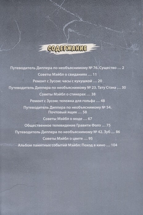 Фанаты «Гравити Фолз» по достоинству оценят эту коллекцию комиксов, выпущенную по материалам мини-эпизодов, созданных Алексом Хиршем. В книгу вошли 12 комиксов, среди которых такие популярные серии, как "Путеводитель Диппера по необъяснимому", "Советы Мэйбл" и "Ремонт с Зусом".