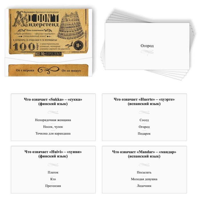 Готовьтесь к веселому соревнованию! В небольшой коробке вас ждет сто карточек, на каждой из которых написано иностранное слово, смешно звучащее по-русски. Под каждым таким словом есть три варианта его толкования, из которых только один является верным. Ведущий вытаскивает карту, зачитывает слово и его варианты определения, а после остальные игроки пытаются угадать, какой из вариантов является верным. У кого это первым получится, тот заработает победные очки. Победит самый эрудированный игрок!