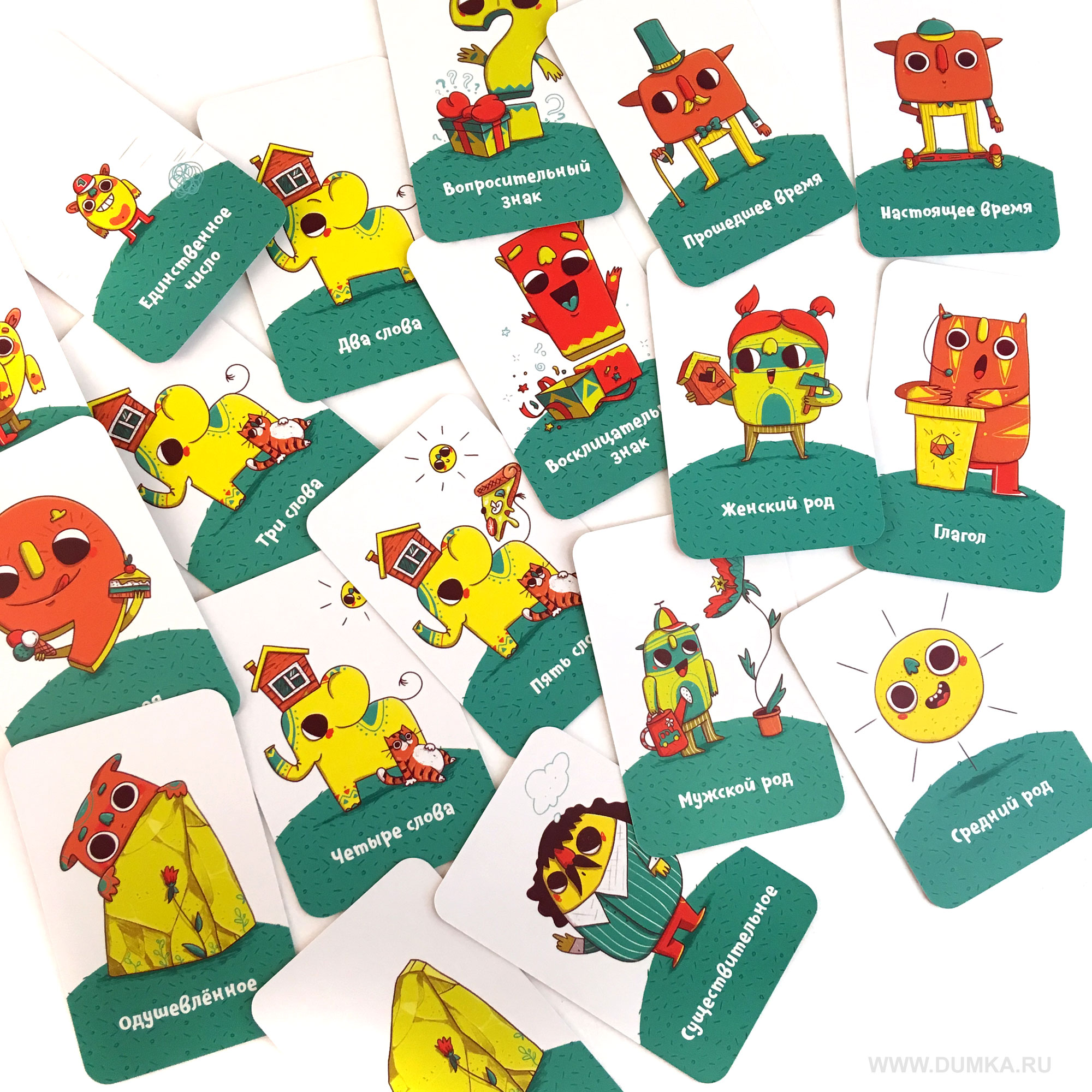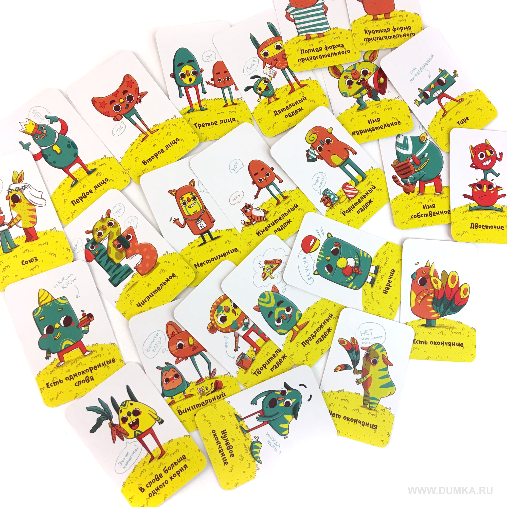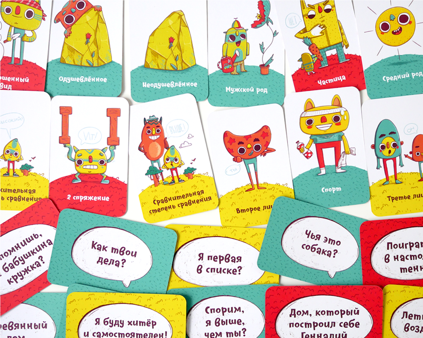 В игре вас встретит красочное игровое поле, карты и песочные часы. Различные термины русского языка будут располагаться на карточках с яркими персонажами, что поможет ребенку быстрее запомнить падежи и склонения. Игроки соревнуются, кто первым дойдет до финиша по полю, а количество ходов определяется количеством фраз, которые говорит участник. Ему нужно произнести фразы, в которых есть термины с двух открытых карт, причем сделать это требуется за 30 секунд. Кто окажется быстрее, тот в конечном итоге и победит!