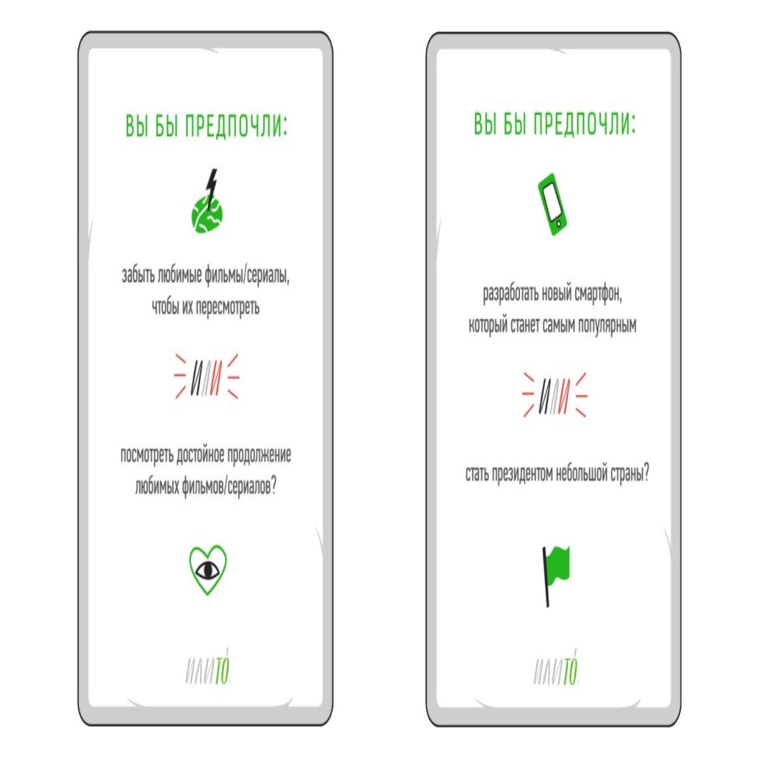 ИлиТо – не просто игра, это чудодейственное средство по укреплению дружеских связей, детальному познанию мрачных потемок чужой души и значительному улучшению качества любой вечеринки, концессии, посиделок, встречи, раута и любой другой формы мероприятий, которые вы посещаете.
