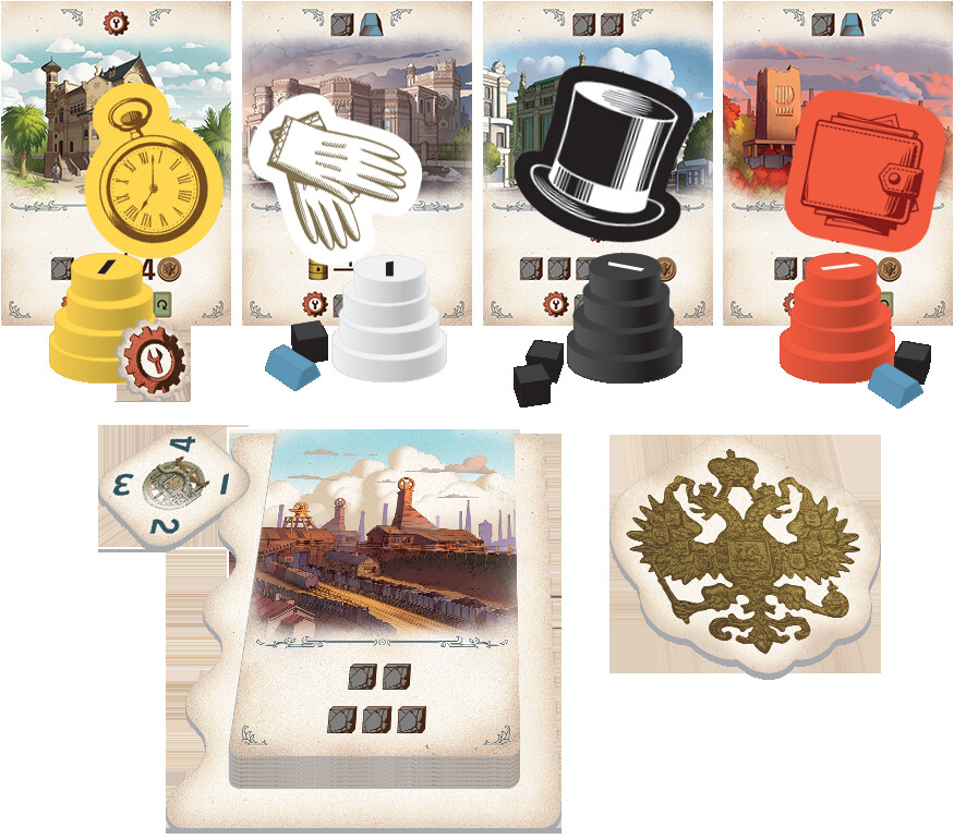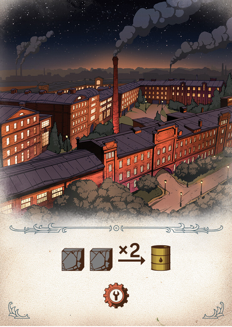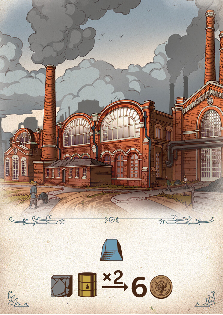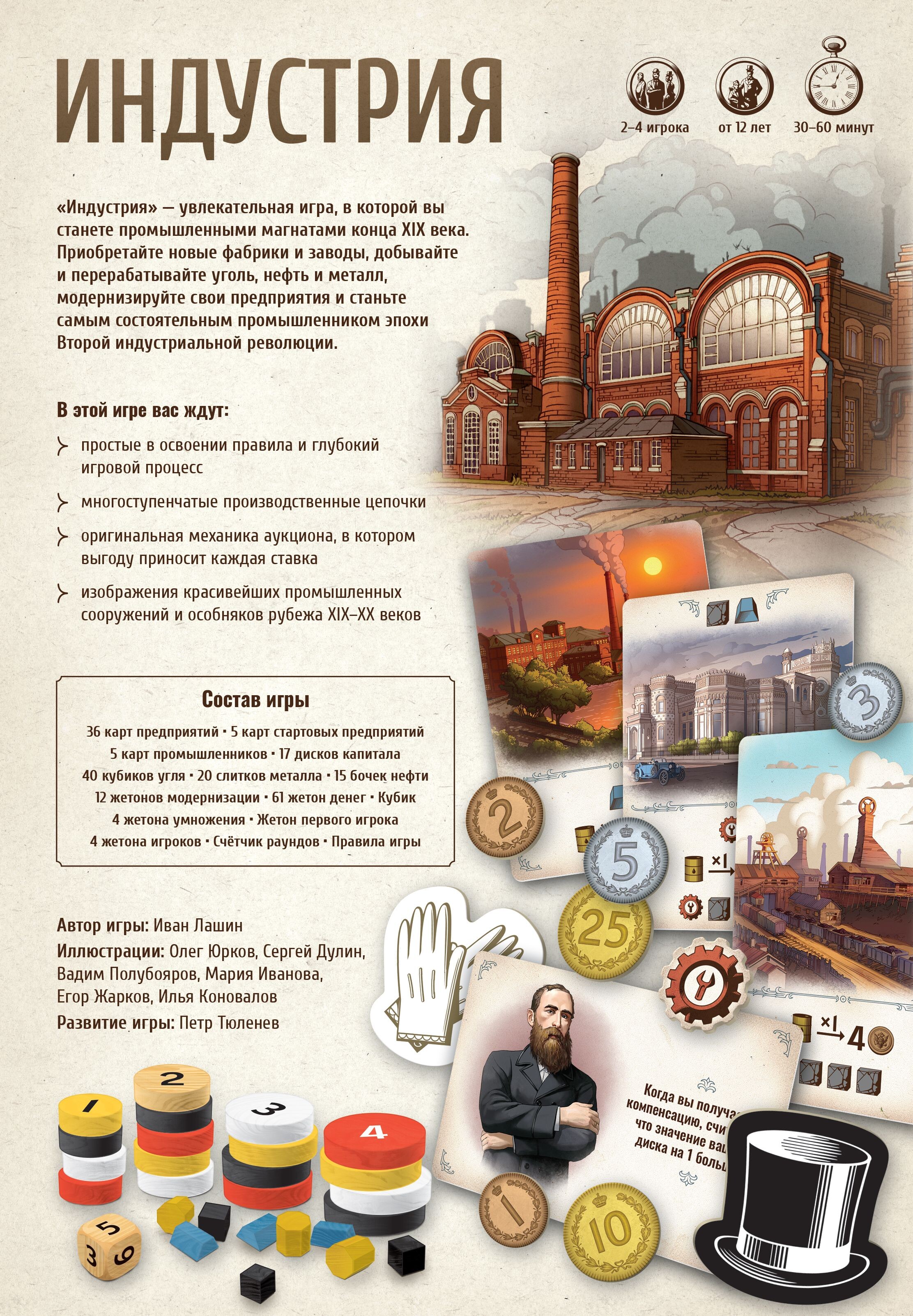 Состоятельные магнаты, пришло время показать, кто из вас лучший! Основанная на механике аукциона, игра "Индустрия" предложит посоревноваться в развитии предприятий и переработке ресурсов. Побеждая на торгах, игрок приобретает завод, а остальные получают компенсацию. Улучшая предприятия, создавая целые производственные цепочки, промышленники борются за лучшую капитализацию. Помимо простого, но глубокого игрового процесса, вы можете попробовать усложненную версию правил, делающую партии еще интереснее. Окиньте взглядом высокие башни заводов, из которых валит дым, поправьте шляпу и вперед, конкурировать за производство!