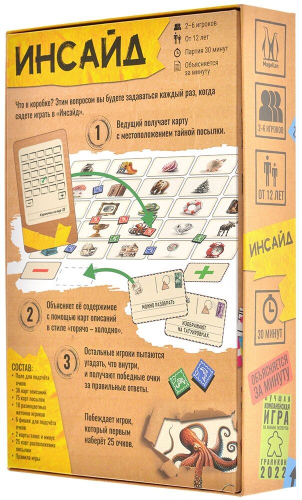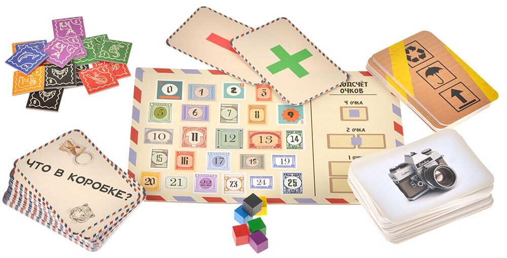 Попробуете угадать, что находится в коробке? Выложив карты с предметами на стол, один из игроков принимает на себя роль ведущего. Он берет карту из колоды с расположением и понимает, что находится в посылке, но никому об этом не говорит. Далее он достает по две карты из колоды с описанием, и это станет его подсказками остальным участникам. Зачитав содержимое, ведущий отдает ход игрокам, а им, в свою очередь, нужно выкладывать жетоны на карты, расположенные рядом с загаданной. Жетоны выкладываются несколькими способами, в зависимости от того, насколько вы уверены в своих догадках. По итогу, после нескольких подсказок, жетоны заканчиваются и ведущий называет загаданную карту. У кого жетоны ближе, тот получит больше призовых очков. Докажите свою проницательность!
