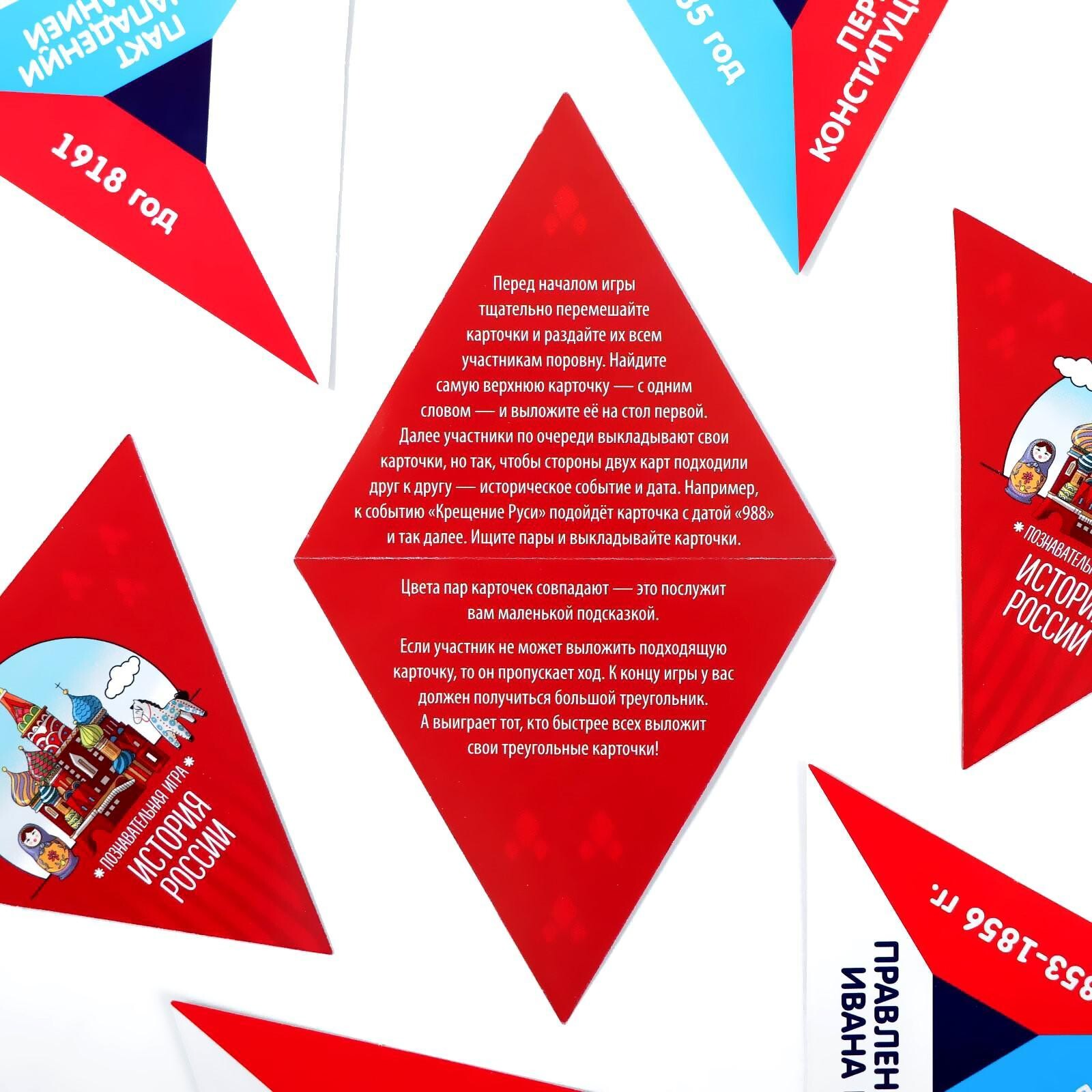 С данной викториной вы легко сможете проверить свои знания по истории и узнать много нового! На картах вы найдете исторические события и даты, комплектующиеся по определенным цветам. Выкладывайте карты по дате и событию рядом друг с другом, стараясь первым собрать треугольник из карт и выложить все с руки. Кто сможет сделать это первым, тот и станет победителем!