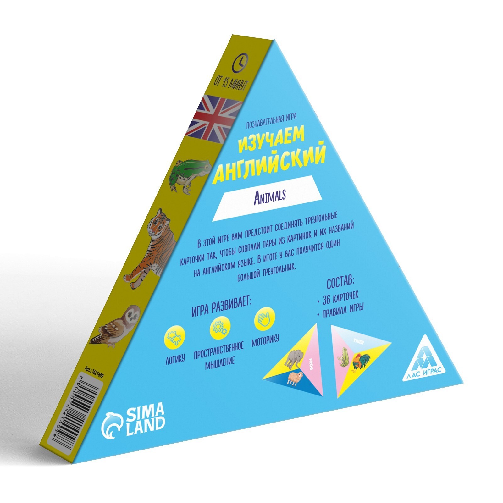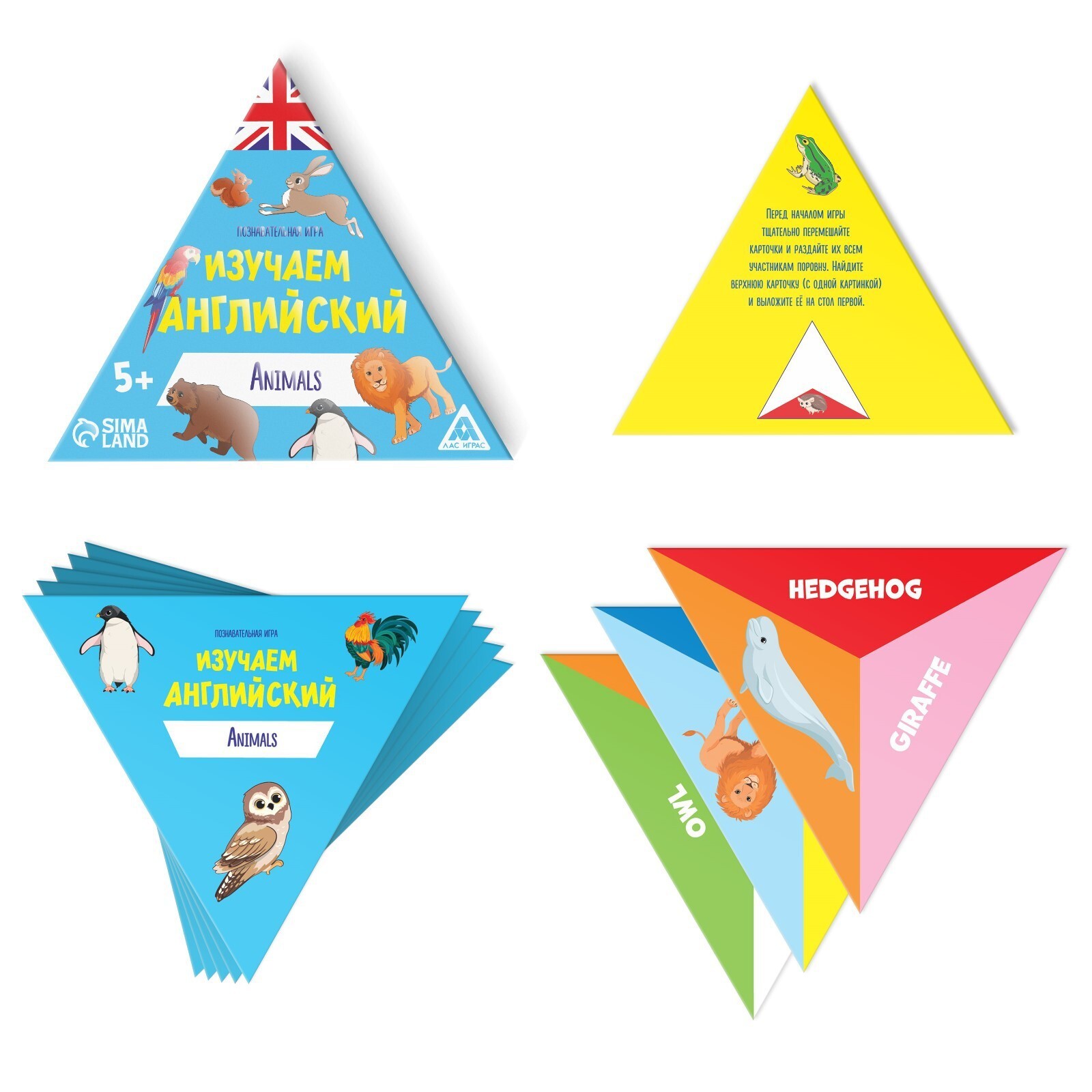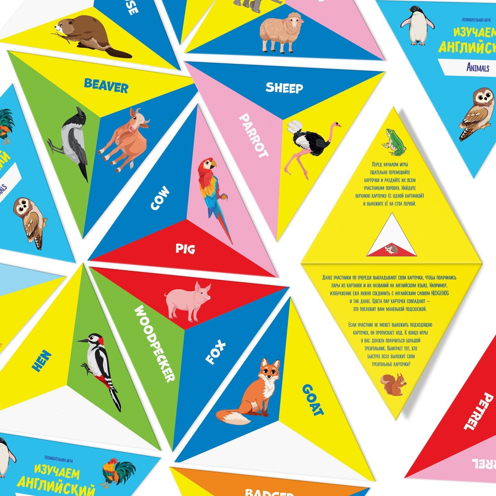 Развивающая детская игра проверит ваши знания английского языка и поможет узнать новые слова. В коробке с игрой вы найдете треугольные карты с названиями животных на английском, а также карты с изображениями представителей животного мира. Попробуйте выложить карты гранями друг к другу по названию и соответствующей картинке. Кто выложит наибольшее число своих карт, не ошибившись, тот и победит!