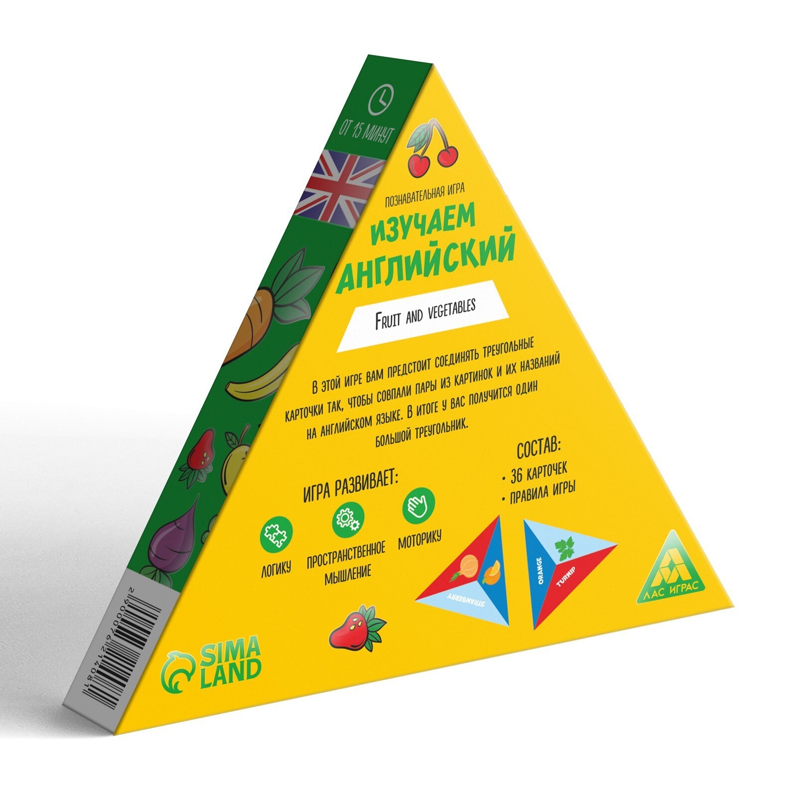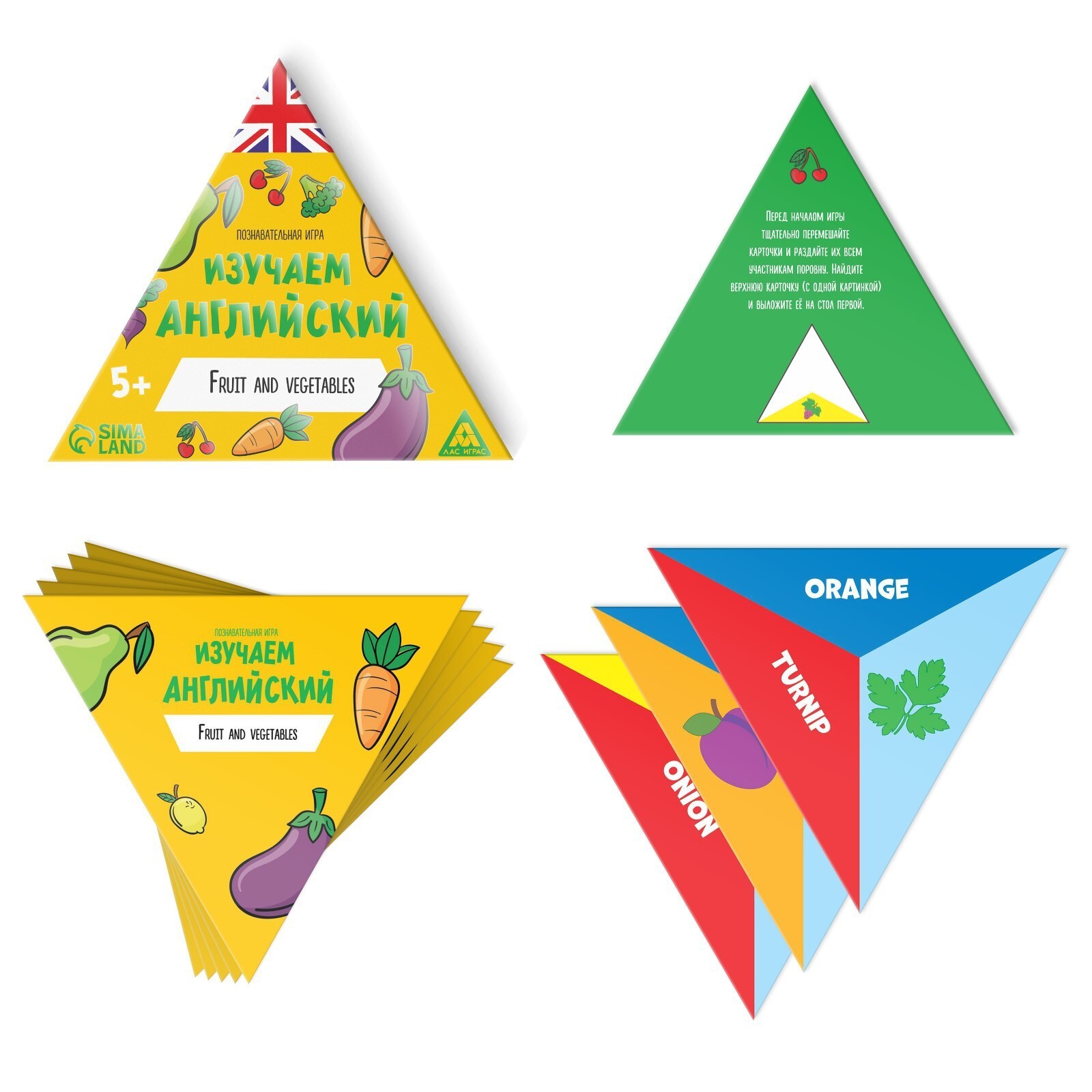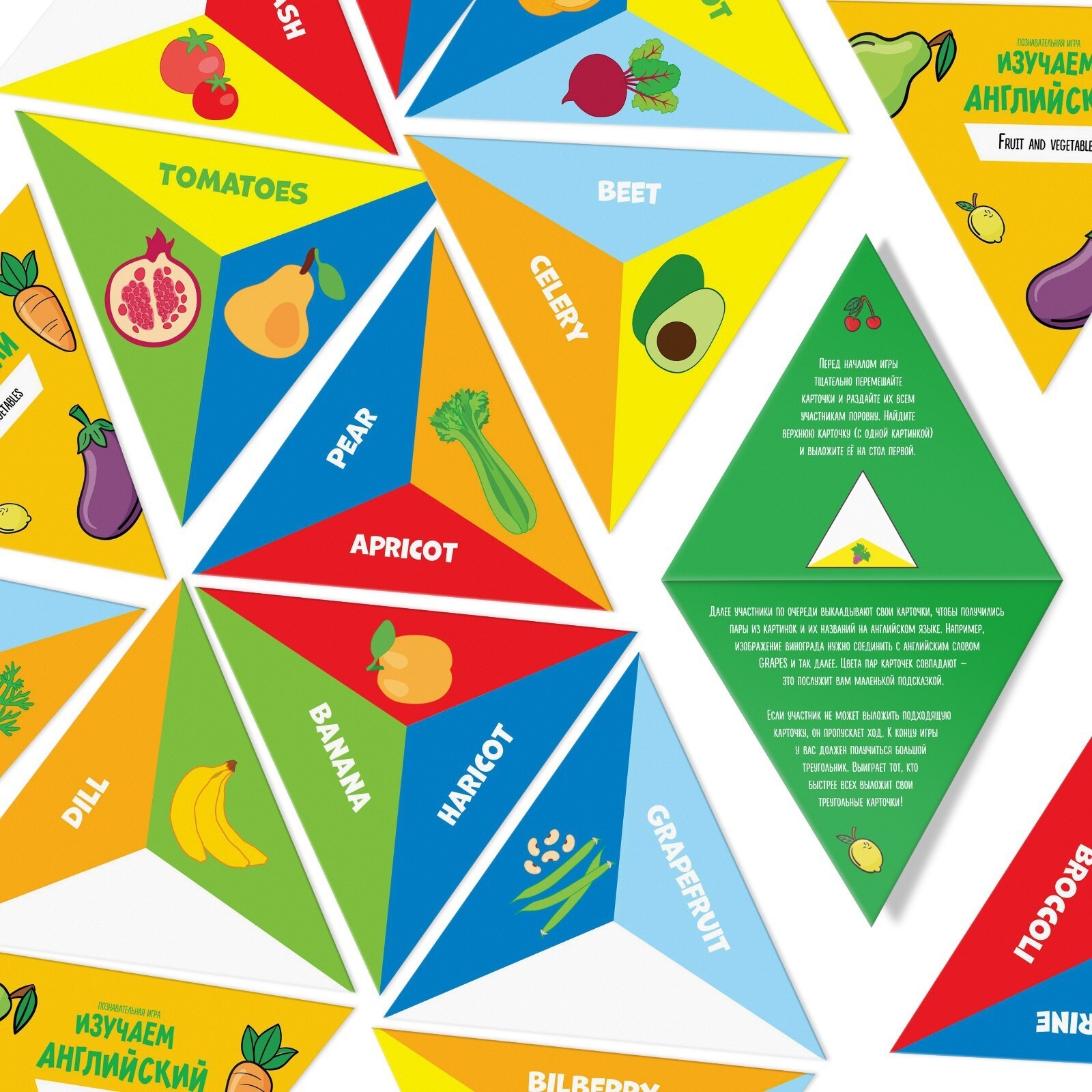 В коробке игры вас ждут треугольные карты с названиями фруктов и овощей на английском языке, а также карты с рисунками фруктов и овощей. Получив карты на руки, игроки стараются выложить как можно большее их количество, прикладывая название к соответствующему рисунку. Проверьте свои знания слов, и узнайте много новых обозначений!