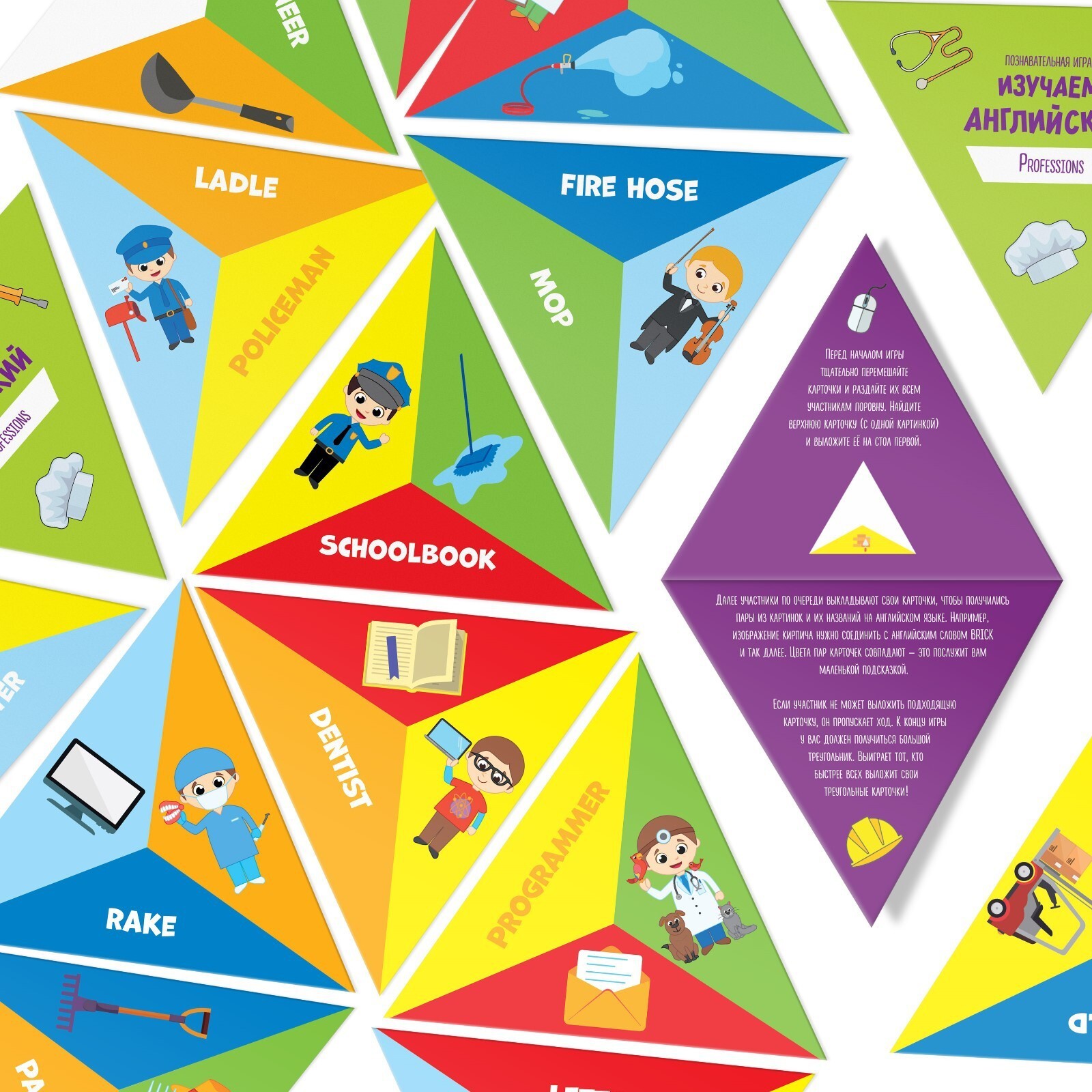 Проверьте свои знания и пополните словарный запас с данной компактной игрой! Внутри коробки вы найдете треугольные карты с названиями профессий на английском, а также иллюстрациями с представителями этих самых профессий. Выкладывайте карты грань к грани, ориентируясь по цвету и соответствию названия и рисунка. Кто таким образом выложит наибольшее количество своих карт, тот и станет победителем!