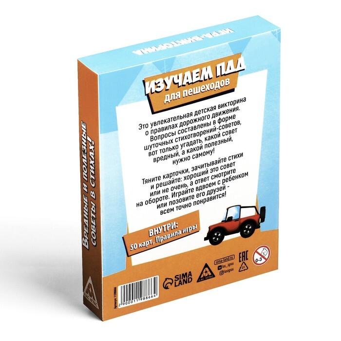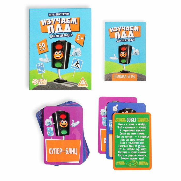 Данный набор подойдет для детского изучений правил дорожного движения. На пятидесяти ярко и красочно оформленных картах вас ждут важные напоминания и простые правила, оформленные в виде стихов. Таким образом, ребенку будет легче запомнить различные аспекты перехода дороги, цветов светофора и прочих важных напоминаний.