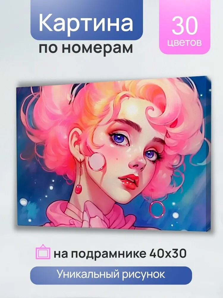 Особенность картины по номерам является то, что контуры изображения уже нанесены на холст, а вам остается только закрасить рисунок определенными цветами. С данным выпуском вы нарисуете красочный портрет девы с розовыми волосами. С помощью красок на тридцать цветов и набора кистей вы сможете создать свой шедевр!