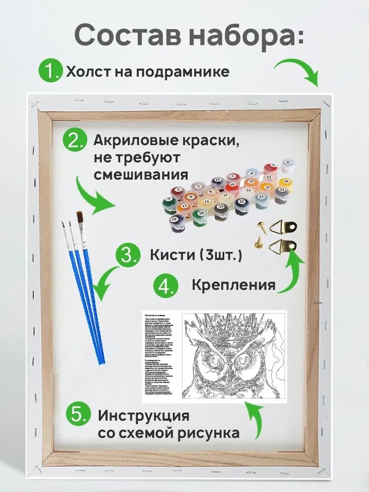 С данным набором вы легко и просто сможете создать свой художественный шедевр! В комплекте вас ждут краски и кисти, а также холст, на который уже нанесено изображение. Вам остается лишь раскрасить его, ориентируясь по номерам, которыми размечены участки рисунка и краски. Почувствуйте себя настоящим художником!