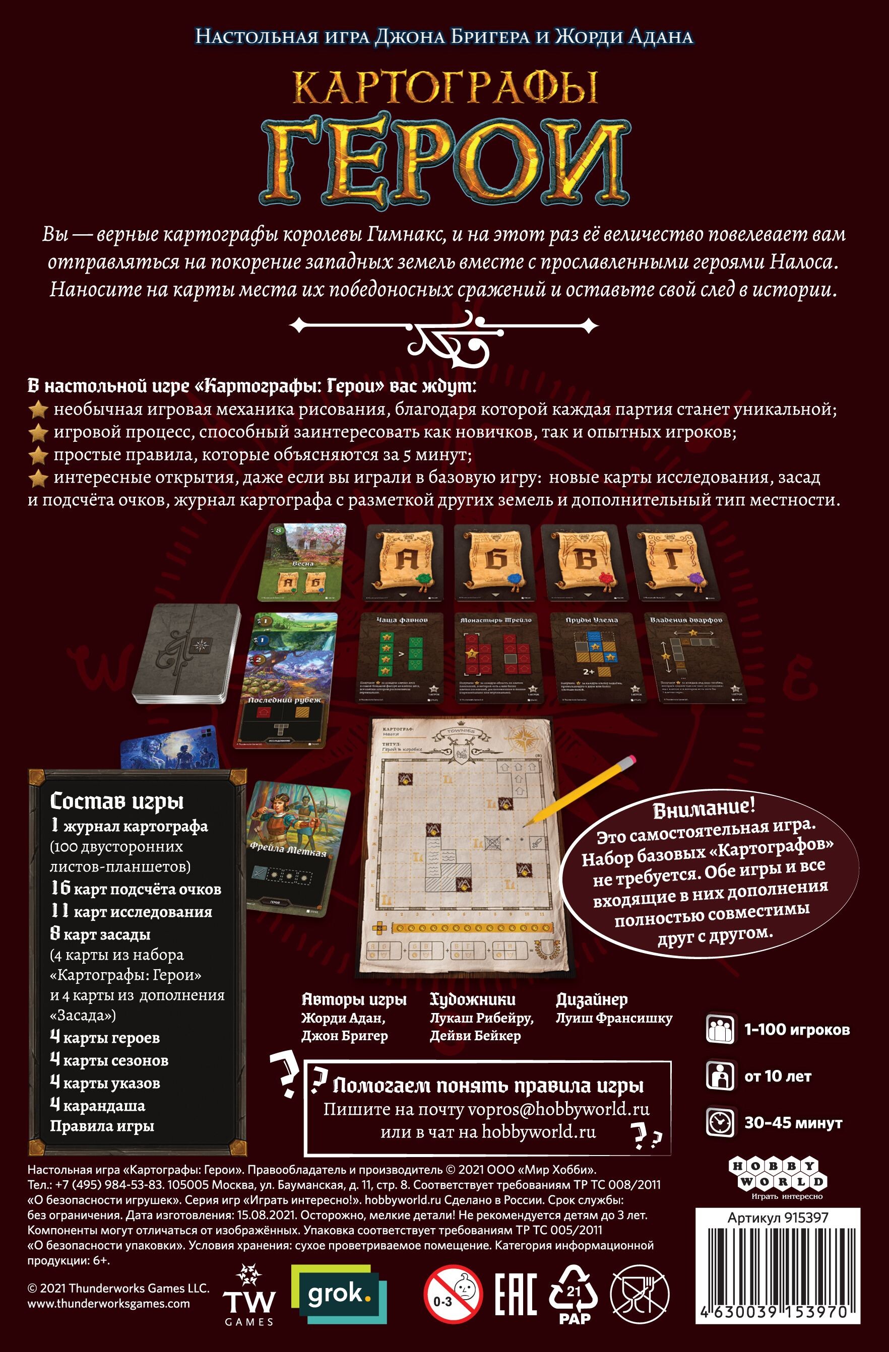За определенные участки территории игроки будут получать победные очки, и набравший наибольшее количество, станет победителем! Сыграйте в эту игру отдельно, или смешайте с оригинальными "Картографами" для большего разнообразия. Проходите в одиночку, или огромной компанией, - Западные земли ждут своих героев!
