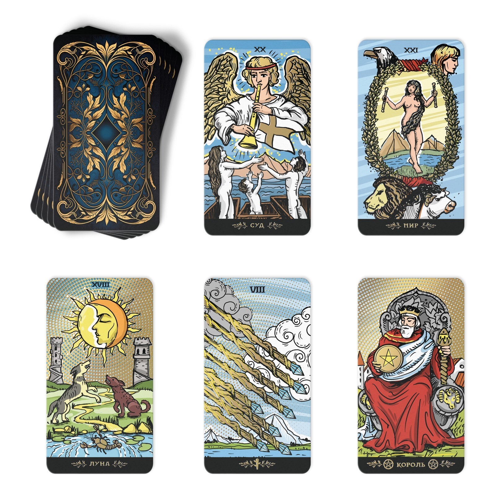 Карты таро подразделяются на несколько аркан и обладают разными значениями. Подходящие для гадания, карты, как считается, помогут вам найти ответы на интересующие вас вопросы и приоткрыть тайну того, что ждет впереди. В коробке вы найдете семьдесят восемь красочных карт, а также инструкцию по раскладам.