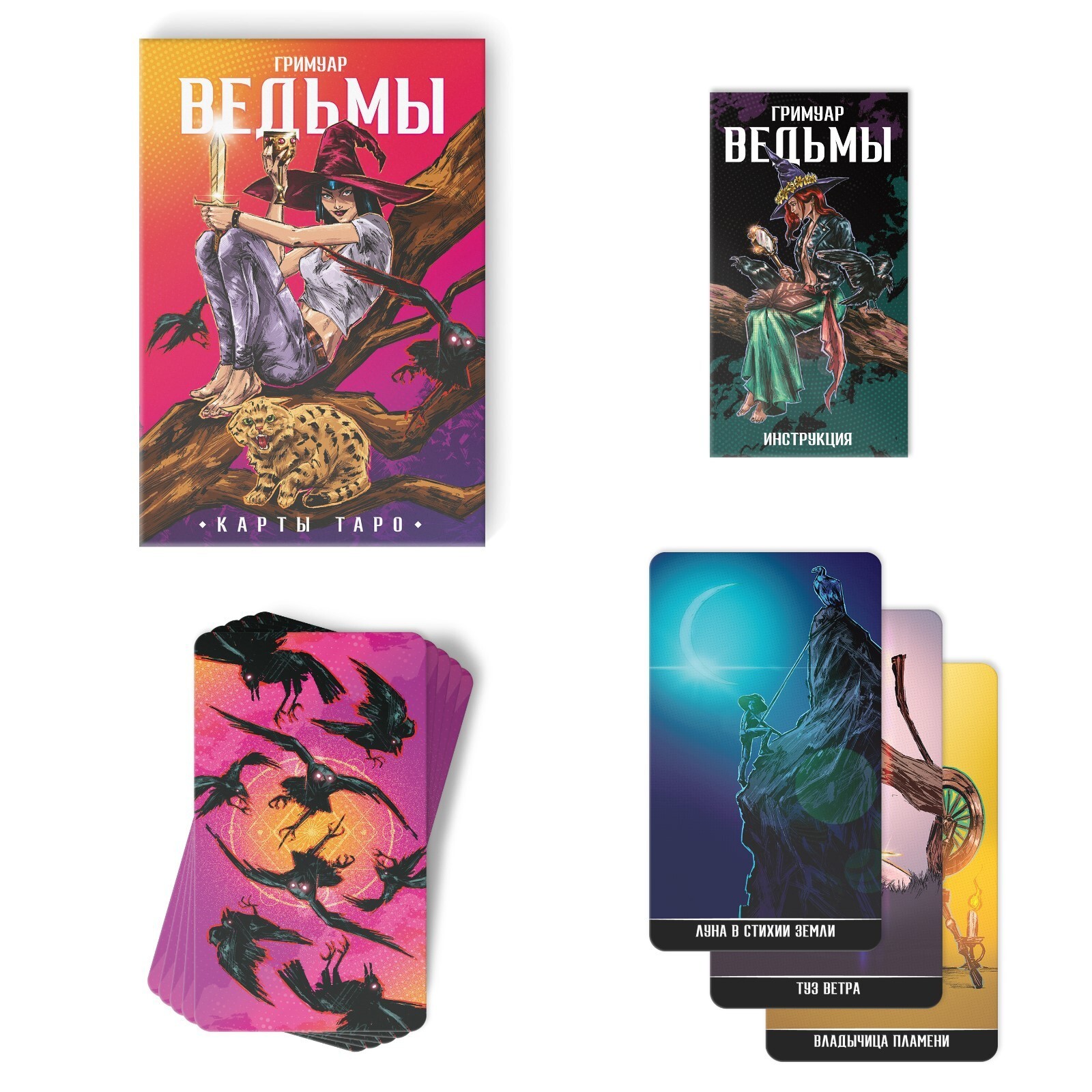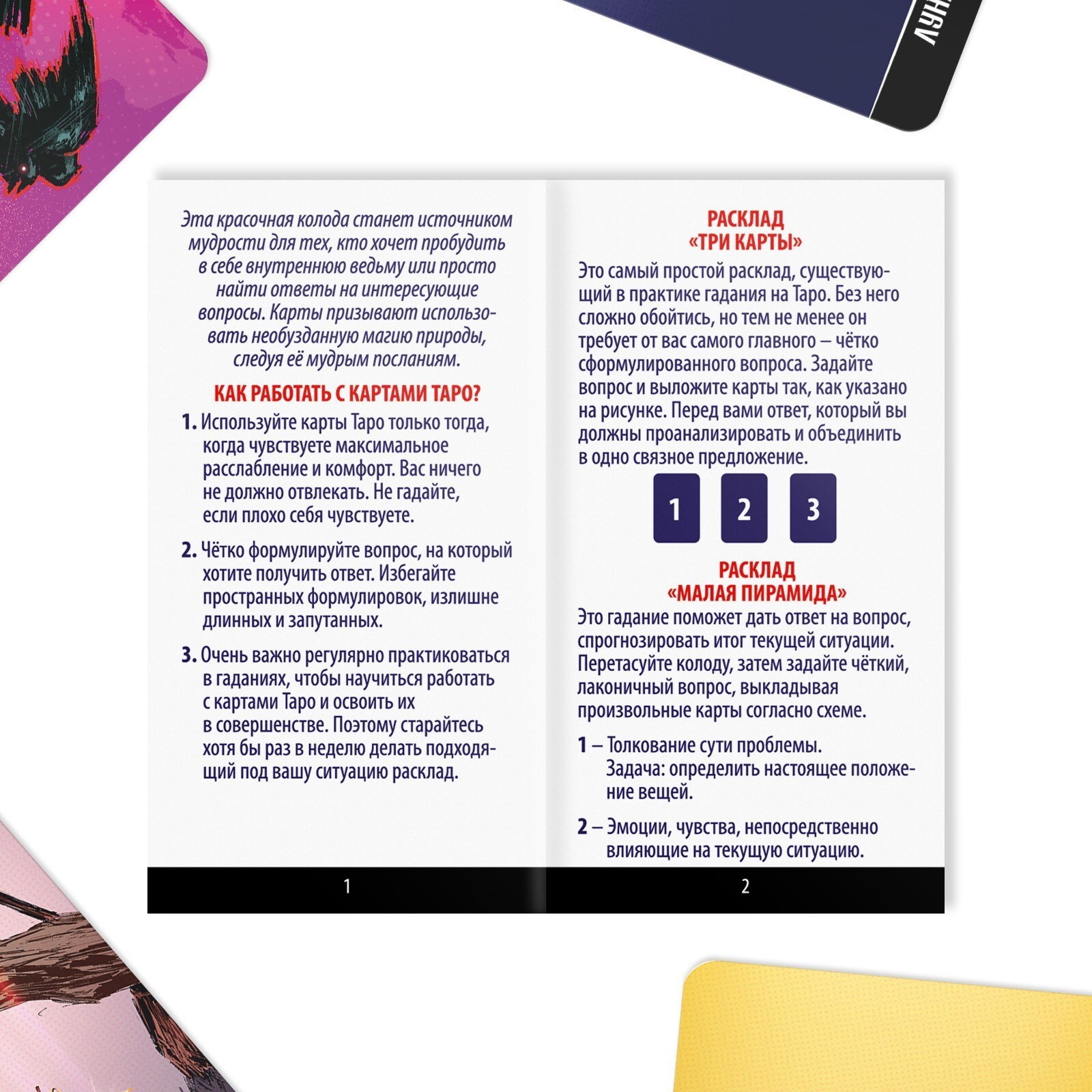 Красочная колода карт таро подойдет для гадания. Как считается, расклад карт поможет вам найти ответы на интересующие вопросы и понять, что ждет вас в будущем. Ярко оформленный, данный набор содержит удобную инструкцию по раскладу.