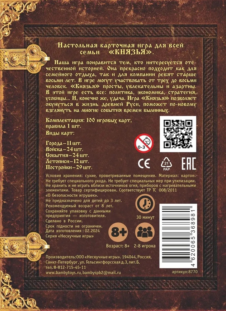 Вас ждет ожесточенное карточное противостояние, обладающее гибкой сложностью и высокой реиграбельностью. В роли древних славянских правителей игрокам предстоит доказать свое превосходство, грамотно разыгрывая различные карты, делящиеся на армии, города, летописи и события. Каждый из типов карт обладает своими уникальными свойствами, позволяя получать очки славы, переманивать армию врага к себе, а также усиливать свою армию, или получить больше призовых очков. При наличии определенной карты вы даже сможете завершить игру досрочно, когда вам будет удобно. Благодаря всем этим действиям победит правитель, который сможет за определенное количество ходов набрать наибольшее количество очков славы. Кто станет лучшим князем на Руси?