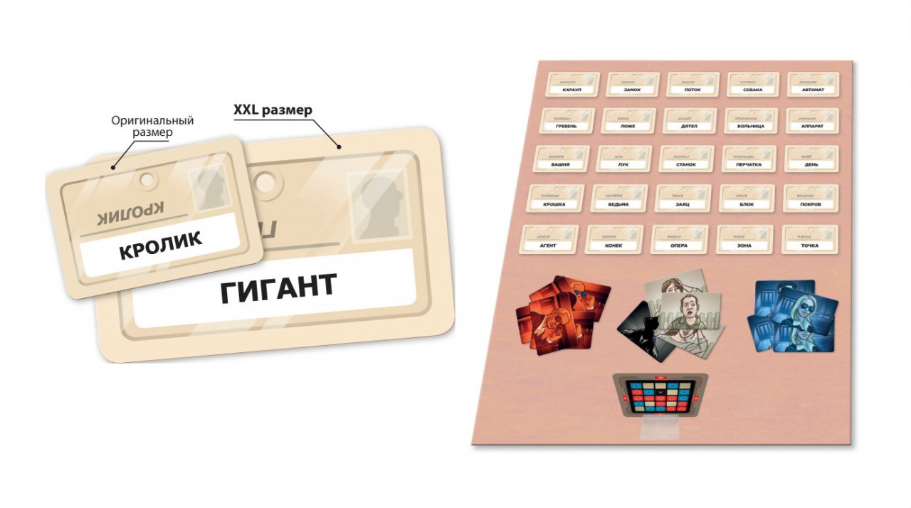 Почувствуйте себя агентом под прикрытием! Данная версия знаменитой игры отличается увеличенным размером - теперь информацию с карт гораздо легче прочитать, а правила остались неизменными - поделившись на команды, игроки стараются найти на картах своих агентов. Делается это с помощью подсказки капитана - одним словом он должен дать подсказку к поиску. Главное, не выбрать агентов другой команды, ведь тогда ход перейдет им. А если вы найдете на поле убийцу, ваша команда тут же проиграет, поэтому надо быть крайне осторожным и проявить все свои навыки эрудиции и смекалки!