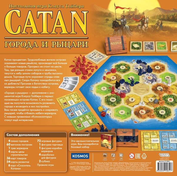Теперь ваши партии в знаменитую стратегию станут еще увлекательнее! Данное расширение добавит в игру новых ресурса, добыча и продажа которых позволит вам строить укрепления городов, что обеспечит дополнительную защиту. Помимо этого, на дорогах теперь вы сможете поставить рыцарей, несущих караул и защищающих от нападок разбойников. В свою очередь участник, владеющий наибольшим количеством рыцарей, получит награду. Попробуйте классические партии с новыми правилами и станьте победителем!