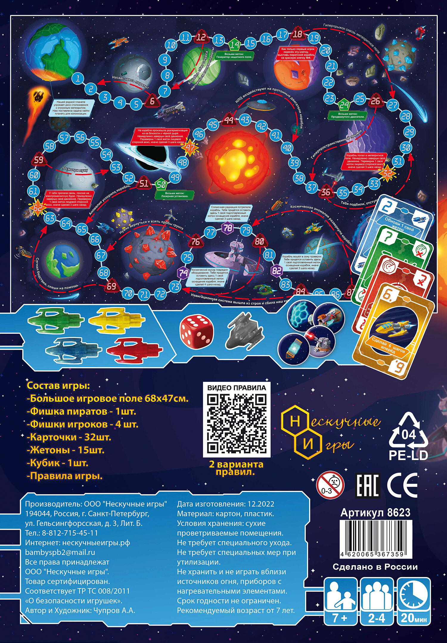 В данной настольной игре участников ждет большое путешествие. С помощью броска кубиков игроки будут перемещаться по большому полю, представляющему собой бескрайние просторы космоса. Остерегайтесь пиратов и астероидов, летите на своих звездолетах к финишу и постарайтесь оставить соперников далеко позади! Выполняйте различные задания и попробуйте два вида правил - космос ждет!