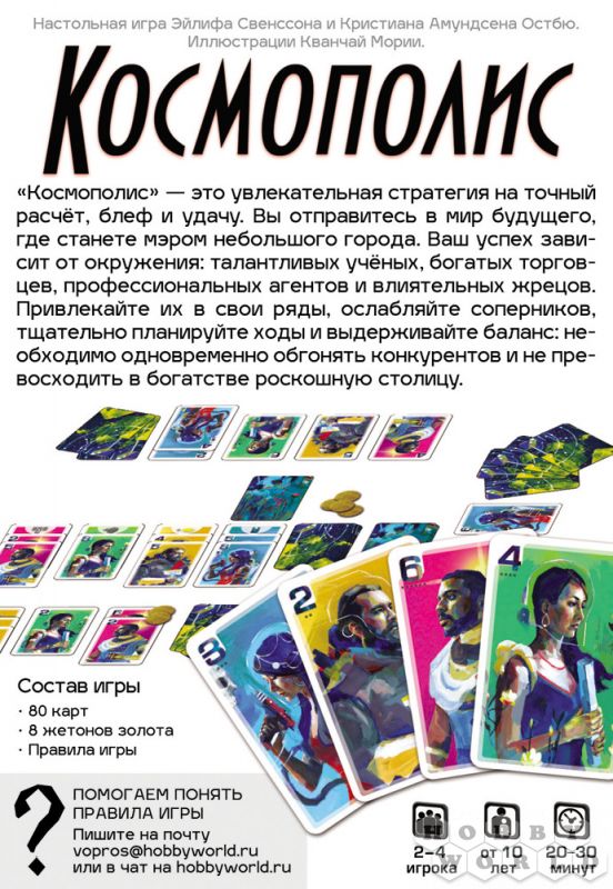 В космическом городке Космополис кипят нешуточные страсти! Игроки поборются за звание лучшего мэра. Каждый раунд участники встают перед моральным выбором - отправить открытую карту к себе в город, или в столицу. При выборе столицы вы сможете разыграть способность этой карты, получив себе преимущество. Но, при отправки карт в столицу вы делаете лучше и своим соперникам, поэтому розыгрыш каждой карты будет серьезным и ответственным решением. Игрок, нашедший идеальный баланс в розыгрыше карт, станет победителем!