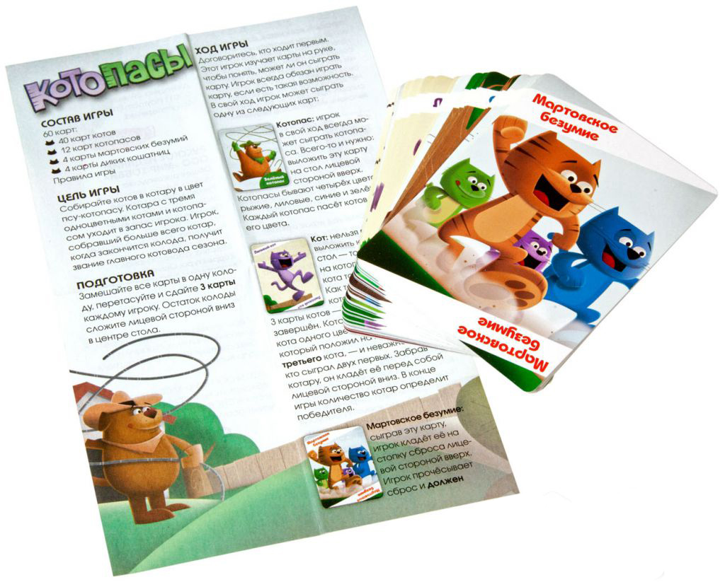 Коты разбежались кто куда, и теперь вам надо их собрать! Выгуливать котов - занятие сложное. Особенно, если коты разбежались. Теперь ничего не остается, кроме как посоревноваться, кто их больше найдет. Игроки стараются собирать котов по цвету, который определяет котопас в колоде. Если вам удалось собрать три кота одного цвета и котопаса, эта комбинация уходит в ваш запас призовых очков. При большой удаче, вам может попасться карта дикой кошатницы, заменяющей собой любую карту пушистого животного. Как только все карты будут сыграны, победит игроков, собравший больше комбинаций, нежели остальные. Чем больше котов, тем лучше!
