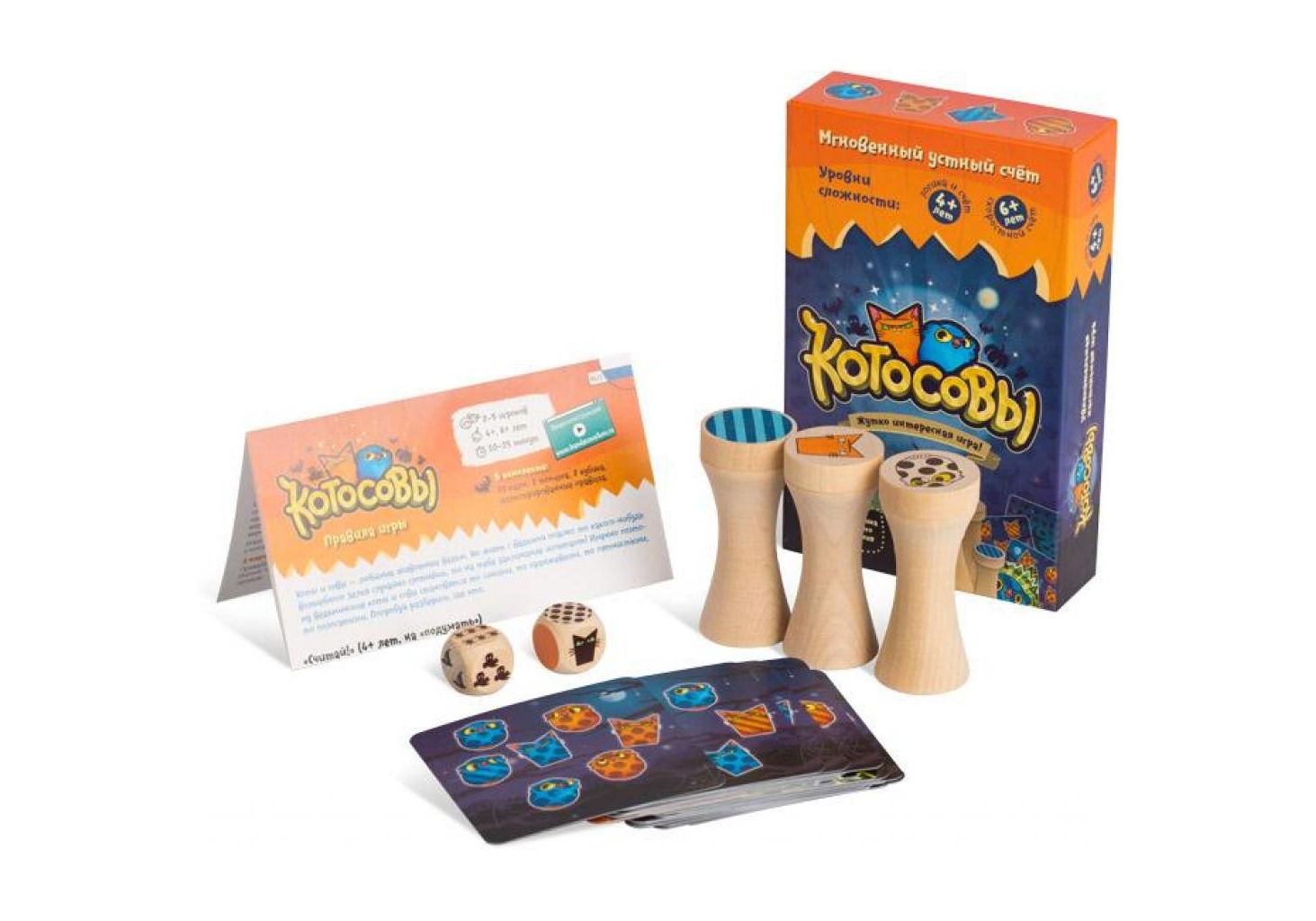 Быстрое развитие устного счета! Перед вами увлекательная игра, развивающая логику, концентрацию и внимание. Внутри коробки вы найдете карты с изображениями котов и сов. Каждый из них может быть синим или оранжевым, пятнистым или полосатым. Их сочетание на картах разнится, а задания на счет по определенному признаку - количеству, виду, цвету и текстуре, могут стать серьезным испытанием. Но благодаря нескольким уровням сложности вы сможете настроить игру для детей разного возраста. Тренируйте счет на скорость, или более вдумчиво, - в любом случае, данная игра порадует и детей, и взрослых, привлекая своей простотой и полезностью.