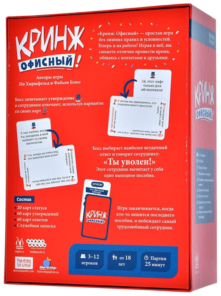 Теперь веселая игра представлена и в рабочем варианте, однако суть ее не поменялась. Один из игроков, который теперь выступает в роли начальника, зачитывает своим подчиненным вопрос с карты, а они, ориентируясь на свою колоду, дают смешной ответ. Чей ответ будет самым несмешным, лишится пособия. Таким образом, игрок, который к концу игры сможет максимально сохранить свою заработную плату, станет победителем!