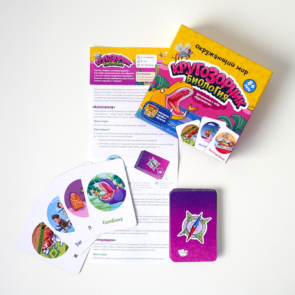 При желании, вы можете объединить данную игру с базовым набором "Кругозорник", и играть станет еще веселее и интереснее! Собирайтесь за одним столом и узнайте про мир биологии чуть больше!