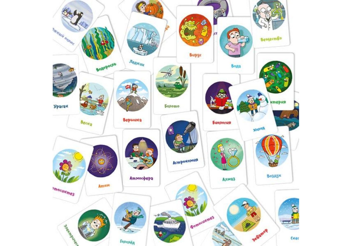 На карточках с большим количеством иллюстраций игрокам предстоит искать схожие или взаимосвязанные картинки. Явления из мира биологии откроются самым внимательным, а в коробке вы найдете усложненный вид правил, при котором термины нужно будет не только найти, но и показать с помощью жестов.