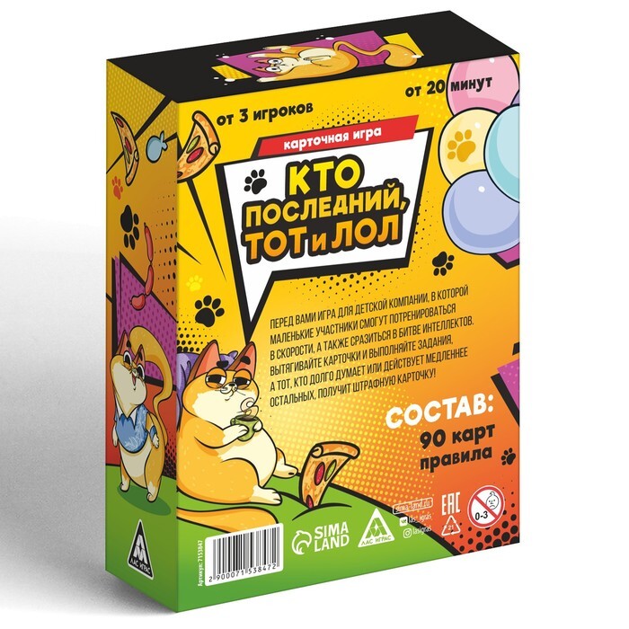 В небольшой коробке вас ждет множество веселых заданий, в выполнении которых игрокам предстоит соревноваться друг с другом. Участникам предстоит выполнять фанты на скорость, изобразительность и внимательность. Игрок, который справится последним, забирает карту себе. По итогу, тот, кто держит в руках наименьшее количество карт, станет победителем!
