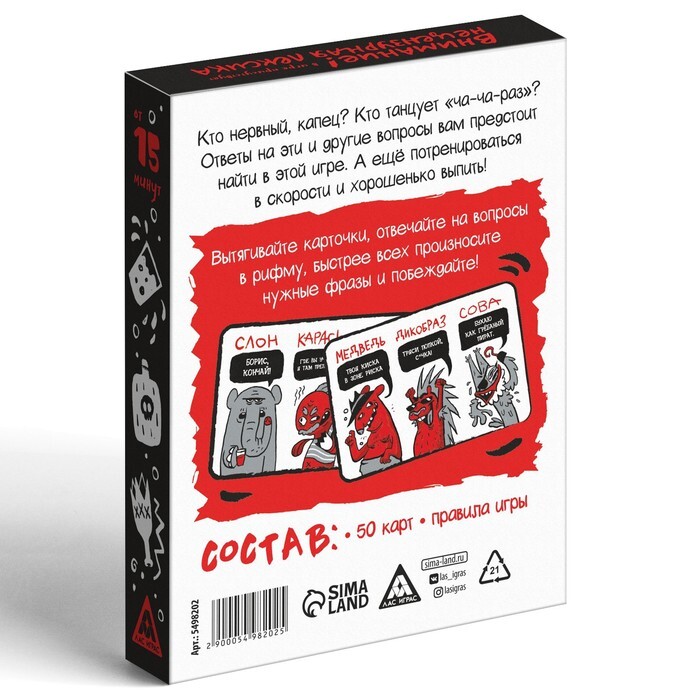 Собирайтесь большой компанией и проведите время весело! Раздайте участникам карты с персонажами, после чего вытаскивайте карту с вопросом и зачитывайте его. Игрокам нужно ответить рифмой, причем назвать персонажа, который может быть в их колоде. Кто первым найдет названного персонажа в своей колоде, станет на шаг ближе к победе. Игрок, нашедший десять карт, станет победителем! А остальным придется выпить.