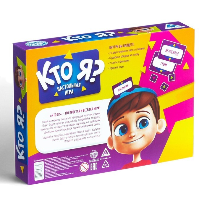 В коробке участники найдут пластиковые ободки для головы и множество карточек а названиями различных предметов, животных и персонажей. Задачей игроков станет угадать, какая карта закреплена у них на лбу, задавая другим вопросы, на которые можно отвечать только "да" или "нет". Угадать необходимо за определенное время, и если вы не успеете, ход перейдет к другому игроку. Если участник отгадал карту, он снимает ее с обода и ставит новую. Первый игрок, который таким образом избавится от всех свои карт, станет победителем!