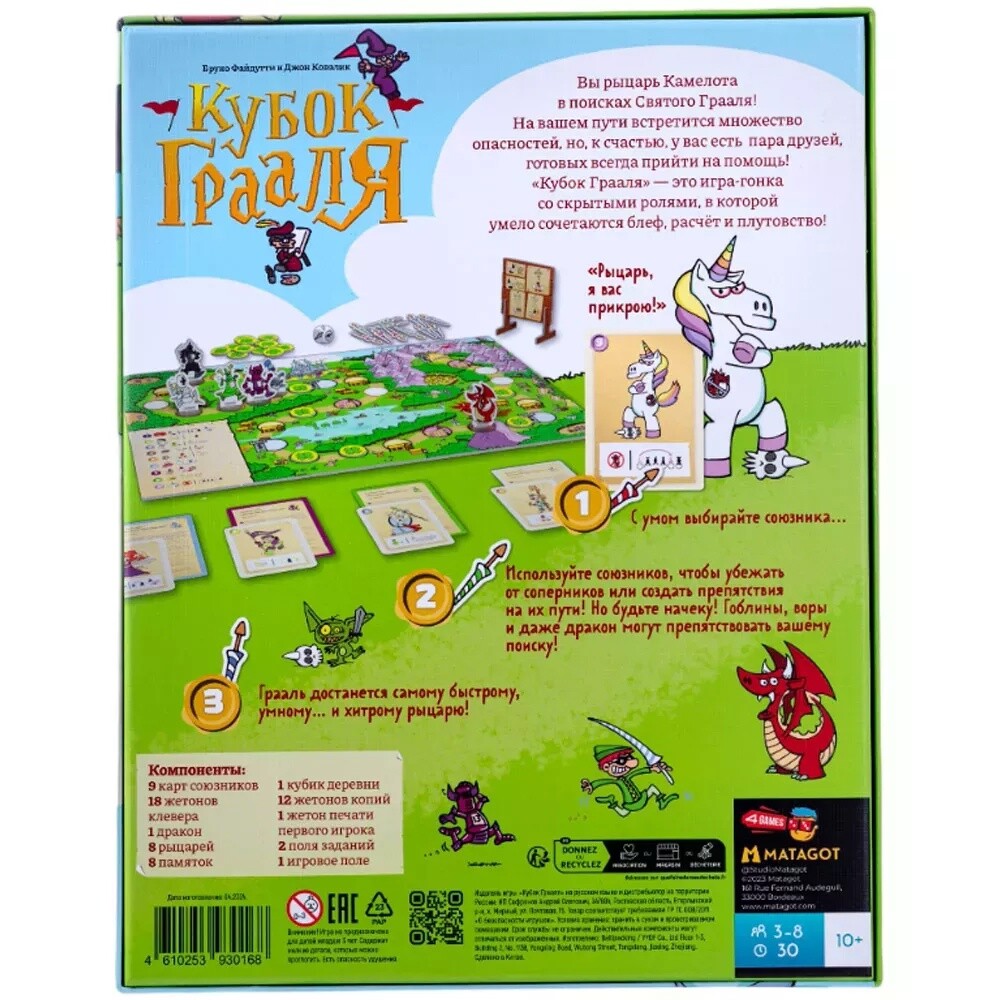 В данном настольном противостоянии, проиллюстрированном художником легендарной игры "Манчкин", участникам предстоит посоревноваться в обладании легендарным артефактом. Каждый игрок выступает в роли рыцаря и получает себе помощника, которого не показывает остальным. Перемещаясь по игровому полю, рыцари выполняют задания, добывают копья и с помощью карт союзников замедляют друг друга. Ваши помощники обладают уникальными приемами, и каждый из них может быть весьма полезен в вашей гонке. На пути к Граалю вам может встретиться опасный дракон, и если у вас нет с собой копья, вашему рыцарю не поздоровится. Соберитесь за одним столом и выясните, кто из вас самый достойный. Попробуйте первым добраться до артефакта и стать победителем!