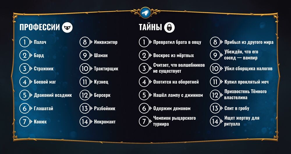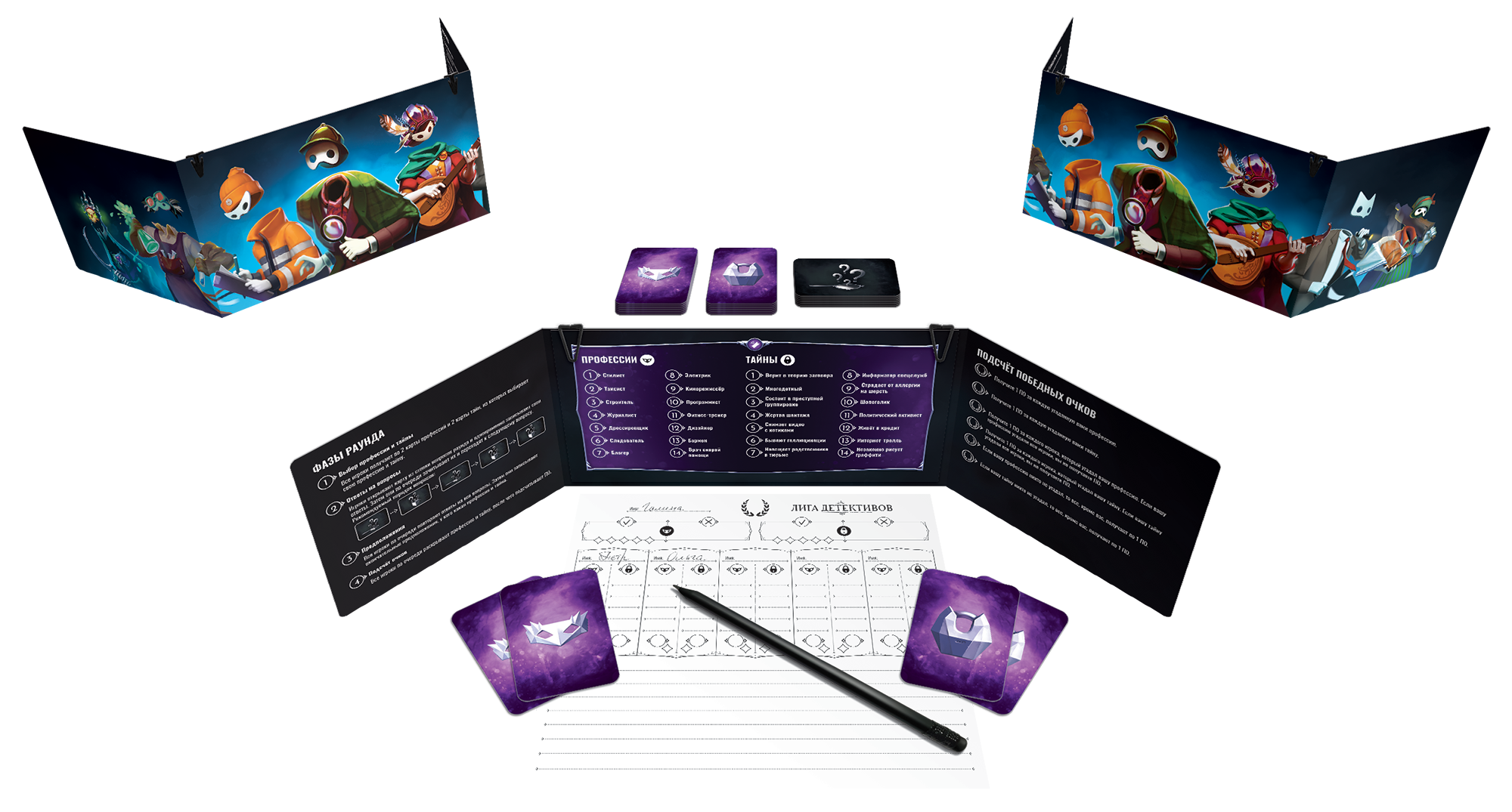 В данной настольной игре участникам предстоит посоревноваться в эрудиции. Каждый игрок получит по карте профессии и тайны, после чего должен будет ответить на пять вопросов о своем персонаже. Отвечать нужно завуалированно, но не слишком, - если игроки не догадаются, вы не получите победных очков. Тоже самое произойдет, если ответы будут слишком легкими.