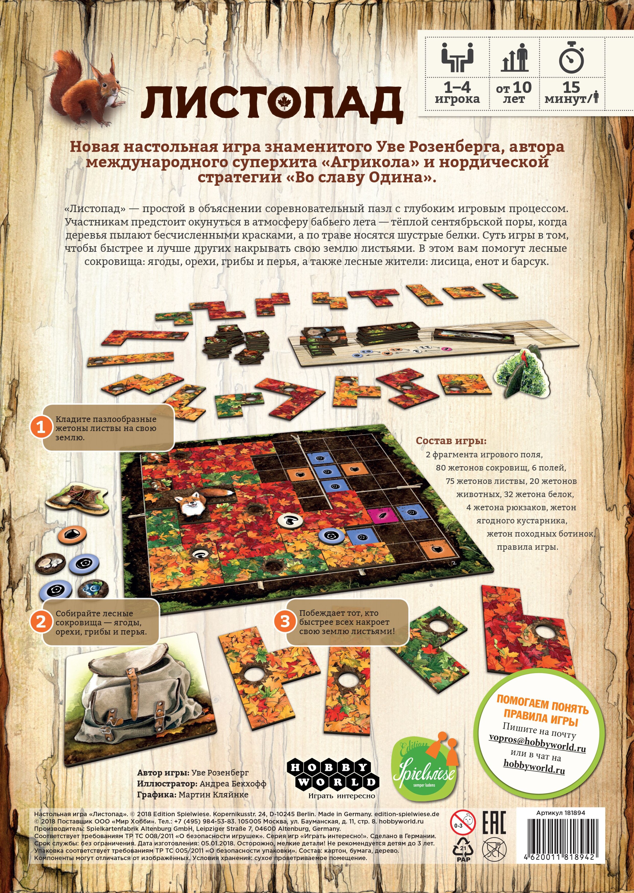 Настольная игра "Листопад" — это логическая игра-головоломка для 2-4 игроков, но при желании в неё можно играть и самостоятельно, как в пазл. Это очень уютная и "ламповая" игра на осеннюю тематику призвана скрасить вам не один вечер. За счёт простых правил в неё могут играть и дети, и взрослые, что превращает "Листопад" в семейную игру. Также её можно использовать и в качестве развивающей игры, ведь чтобы преуспеть в ней, вас потребуется быть внимательным и расчётливым. В самой игре вам предстоит как можно быстрее заполнить своей планшет, состоящий из клеток, с помощью жетонов листвы различной формы, почти как в "Тетрисе"! Подбирайте подходящие формы, постарайтесь попутно собирать "сокровища", которые помогут вам победить в игре, пользуйтесь помощью животных, если создадите подходящую форму — будьте внимательны и вы наверняка победите в этом ярком "Листопаде"!