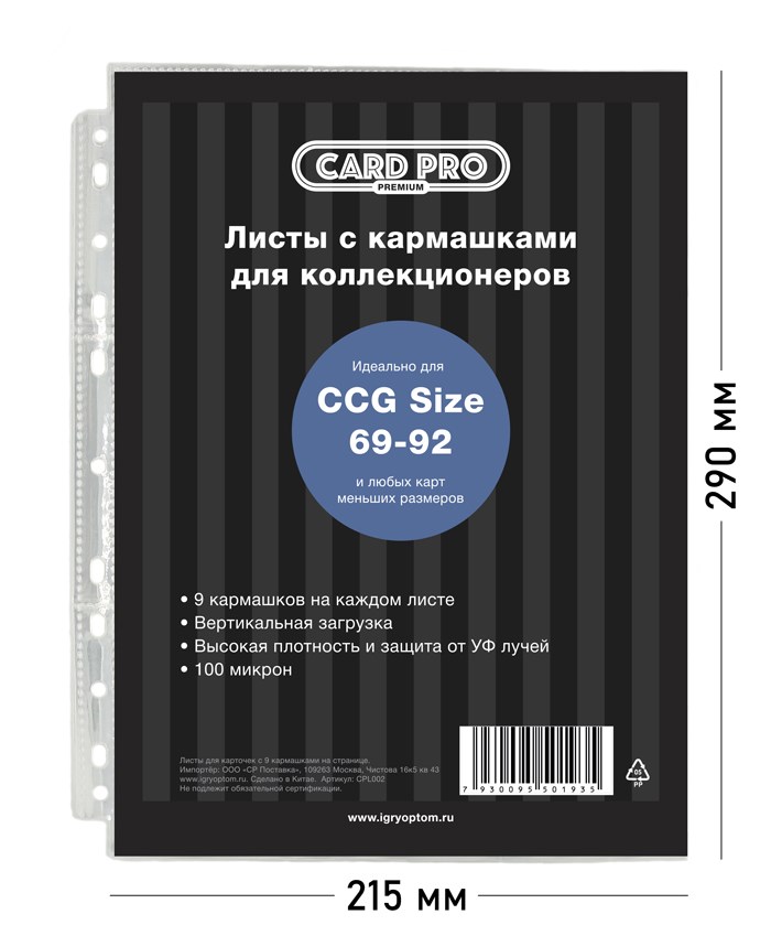 Листы Card-Pro Standart для альбомов (100 шт., 9 отверстий, 100 микрон)